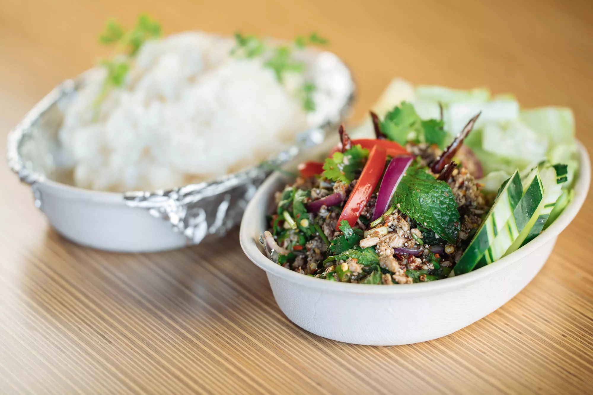 From top left to right, clockwise: Khao Poon soup, papaya salad, sticky rice, stir-fry rice, Laab salad, Lao sausage at Zaap Kitchen