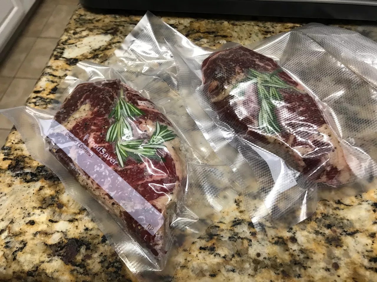 Our rib-eyes, seasoned and sealed, ready for bath time.