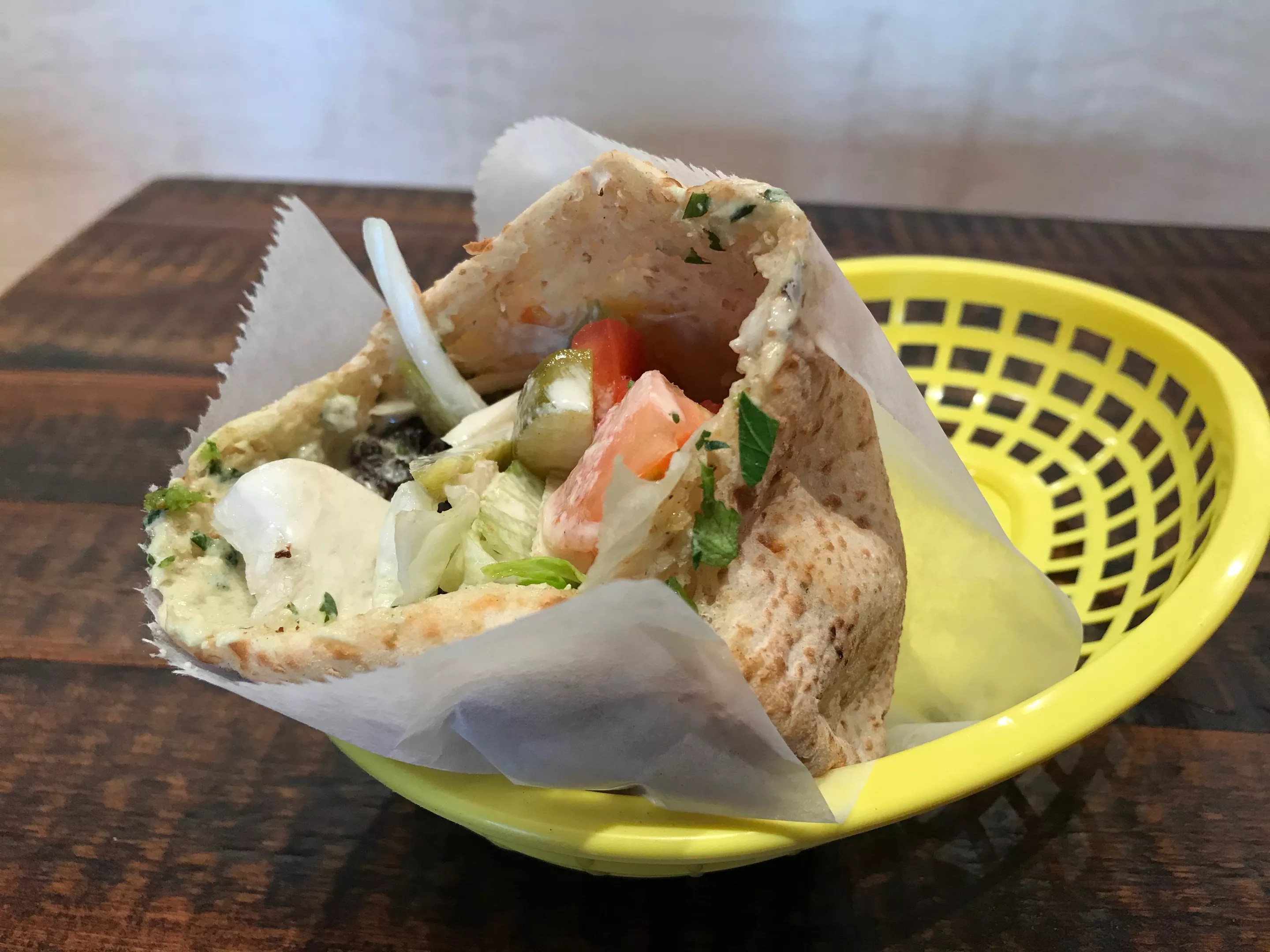 The West Village, falafel, baba ganouj, lettuce, tomato, onion, pickles and tahini sauce for .15.