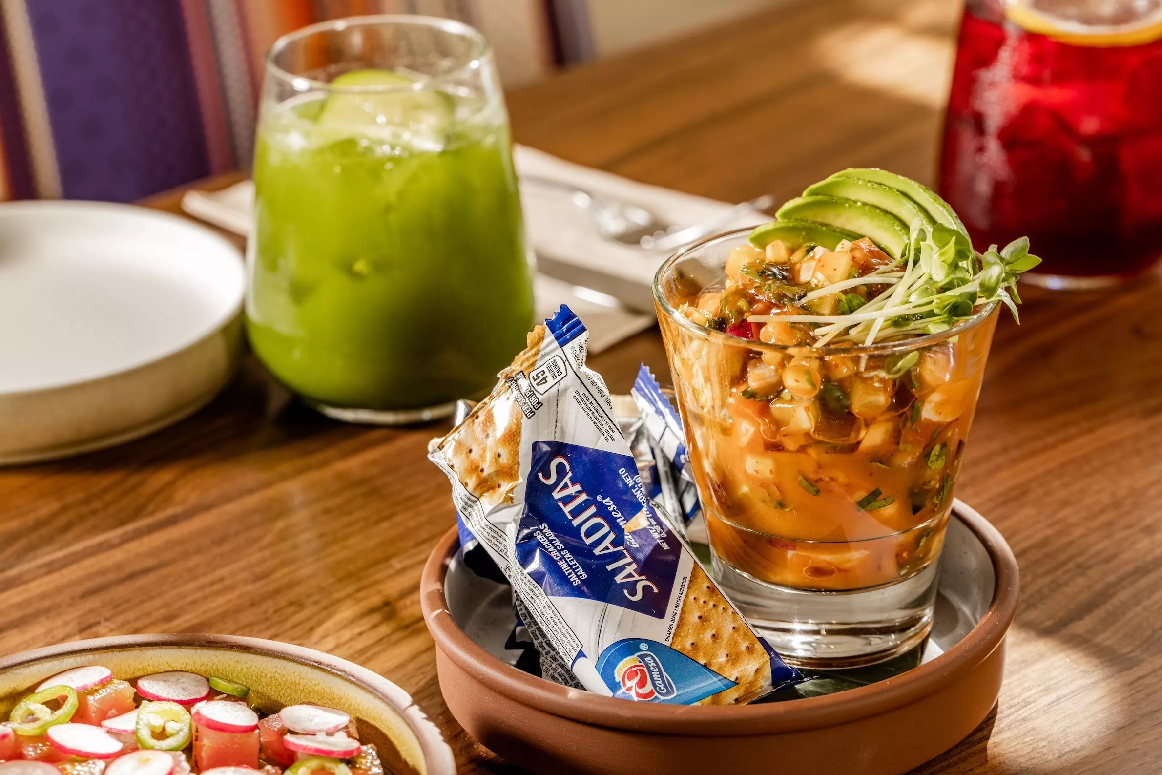 Appetizers include Nachos Para Todos (with refried lentils and chile glazed butternut squash), street corn fritters and heartcakes (hearts of palm with avocado and cabbage slaw). There’s a Really Good Shrimp Cocktail served with Saladitas crackers.