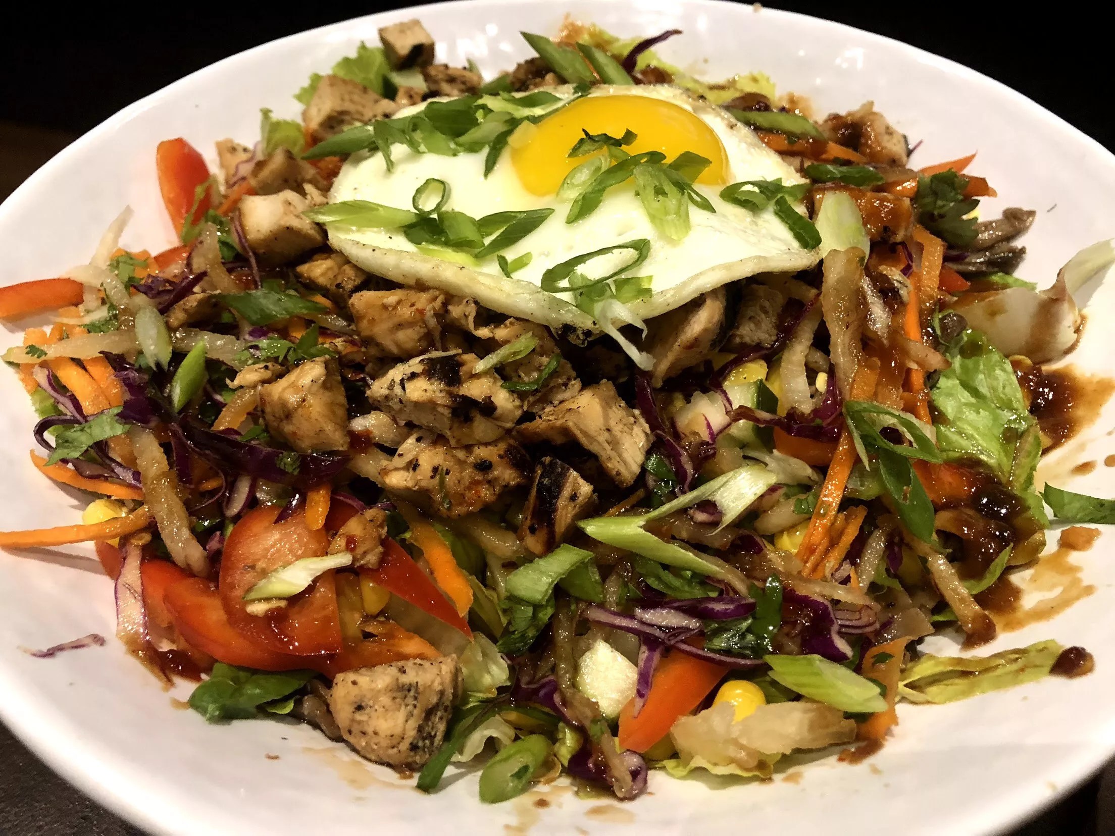 He certainly did just that with the Asian Bowl ($12). Served on top of cilantro lime rice and chopped romaine lettuce, this dish consists of grilled chicken, baby bella mushrooms, red pepper, daikon slaw and cucumber. It is then topped off with a sunny side up egg and drizzled with soy chilli dressing.