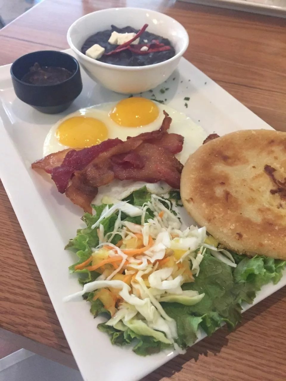 The other sides, save for the cup of velvety, sumptuous black beans, were also questionable. The bacon seemed superfluous, and the sunny-side-up eggs’ whites arrived weeping and mucilaginous. One can envision a more serviceable plate wherein these sides are replaced with another pupusa or two. Or three.