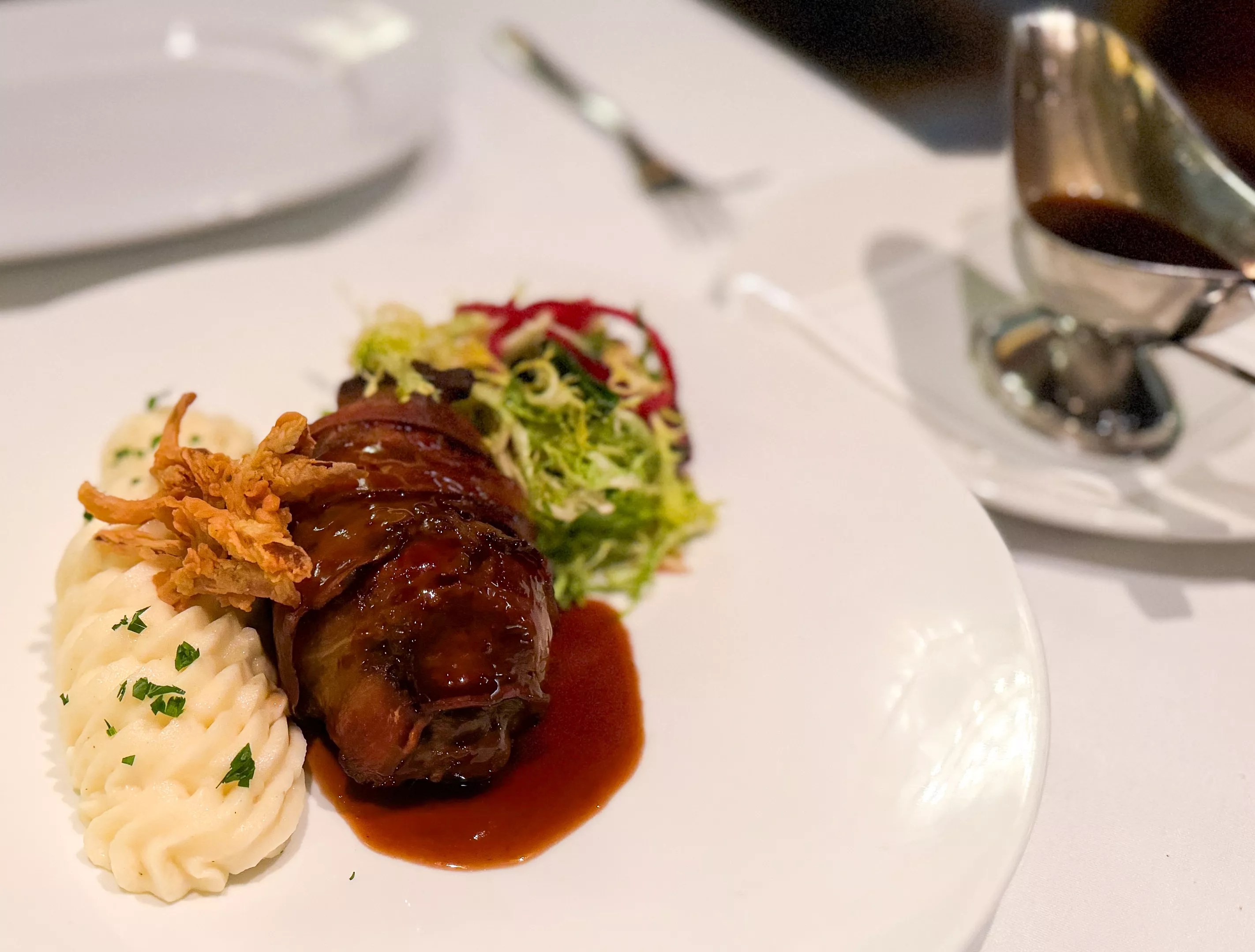 The bacon-wrapped meatloaf comes with a side of whipped russets and a gravy boat.