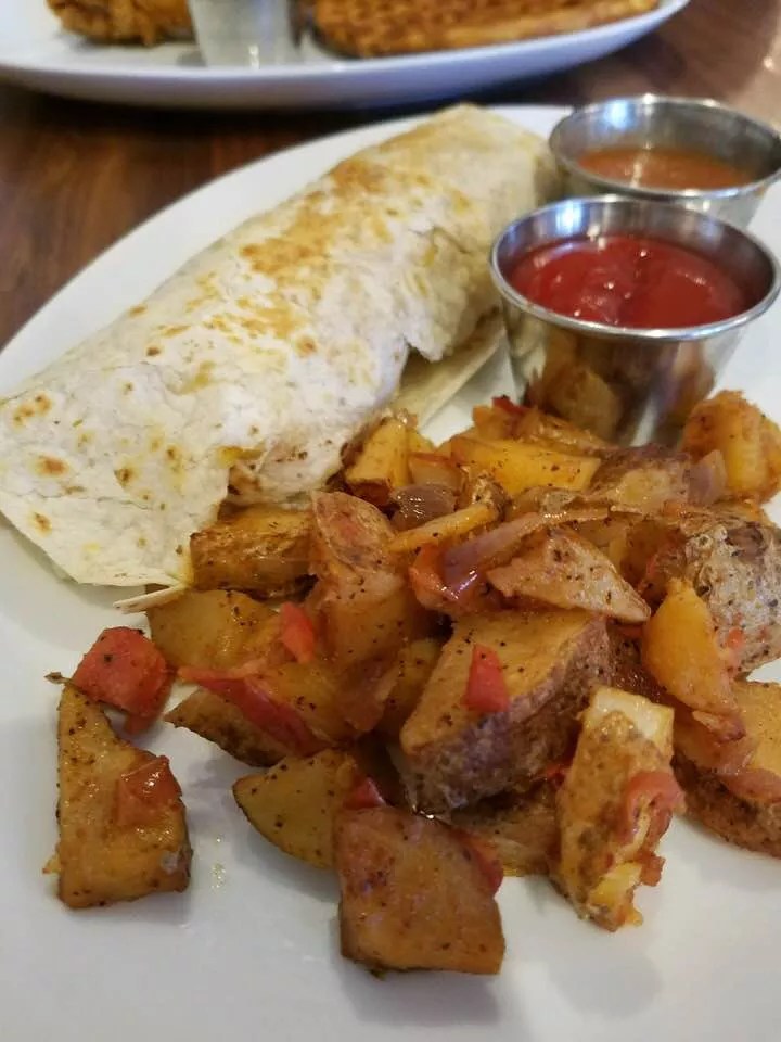 The brunch menu, which prices all entrees at $10, is less chicken-centered than its lunch and dinner equivalents. Nonchicken options consist of quiche, brioche French toast and biscuits and gravy. Despite the beady, watchful eyes of the painted chickens looming overhead, we quickly set our sights on the two poultry options: chicken and waffles and a fried chicken-stuffed burrito. When life presents you with two paths, you take the path that’s been dredged and fried until golden.