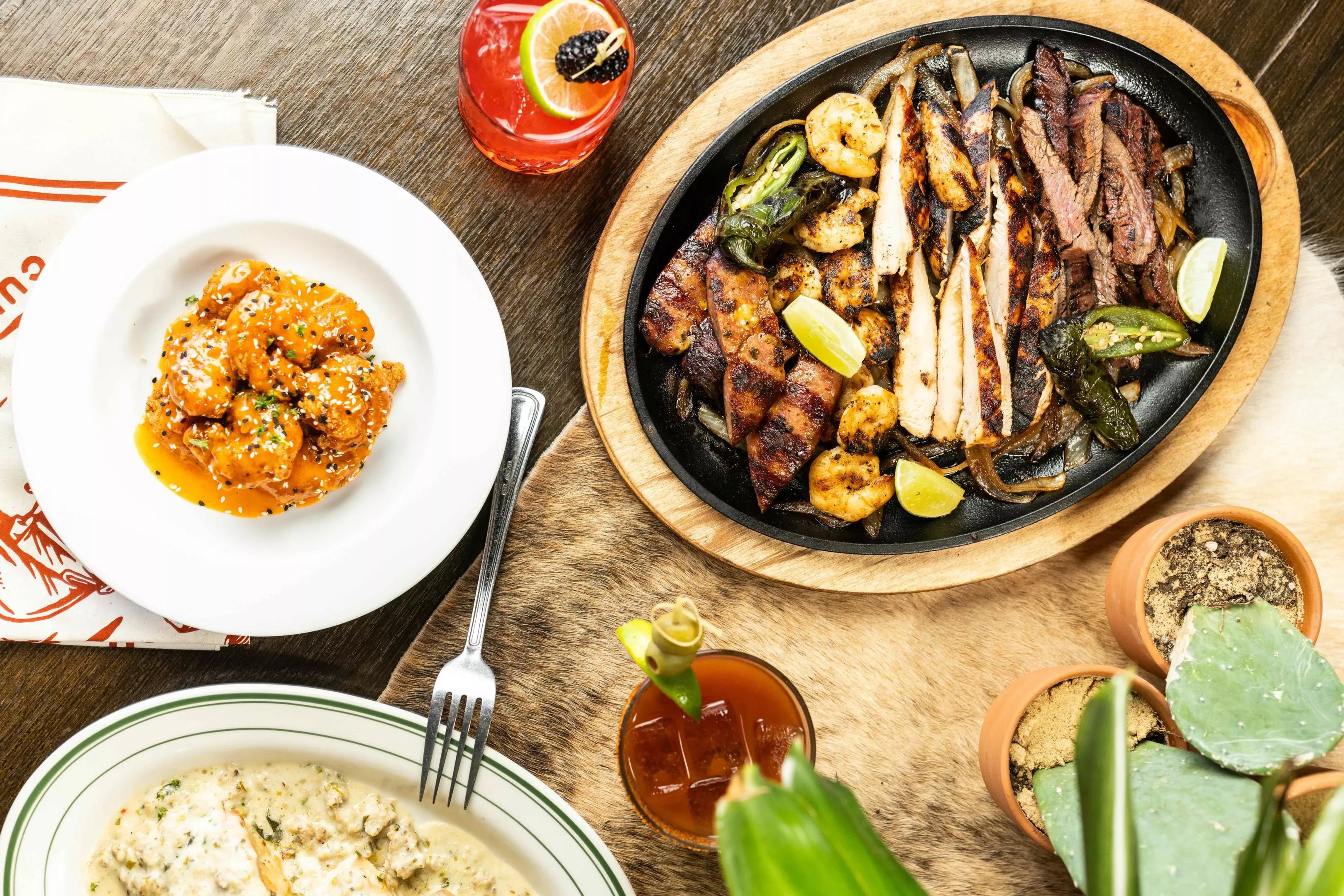 The menu ranges from enchiladas to a double-bone pork chop (24-hour brine) topped with chicken-fried lobster. The Steakhouse Burger is a 10-ounce house-ground patty with a rosemary garlic aioli, caramelized onions and Gruyere cheese. Cadillac Fajitas come with steak, chicken, shrimp and cheddar jalapeño sausage. Chicken Laredo has a creamy spinach dip, Jack cheese, mushrooms, poblano and pico de gallo. Homestyle sides include green beans, mac and cheese and baked potatoes.