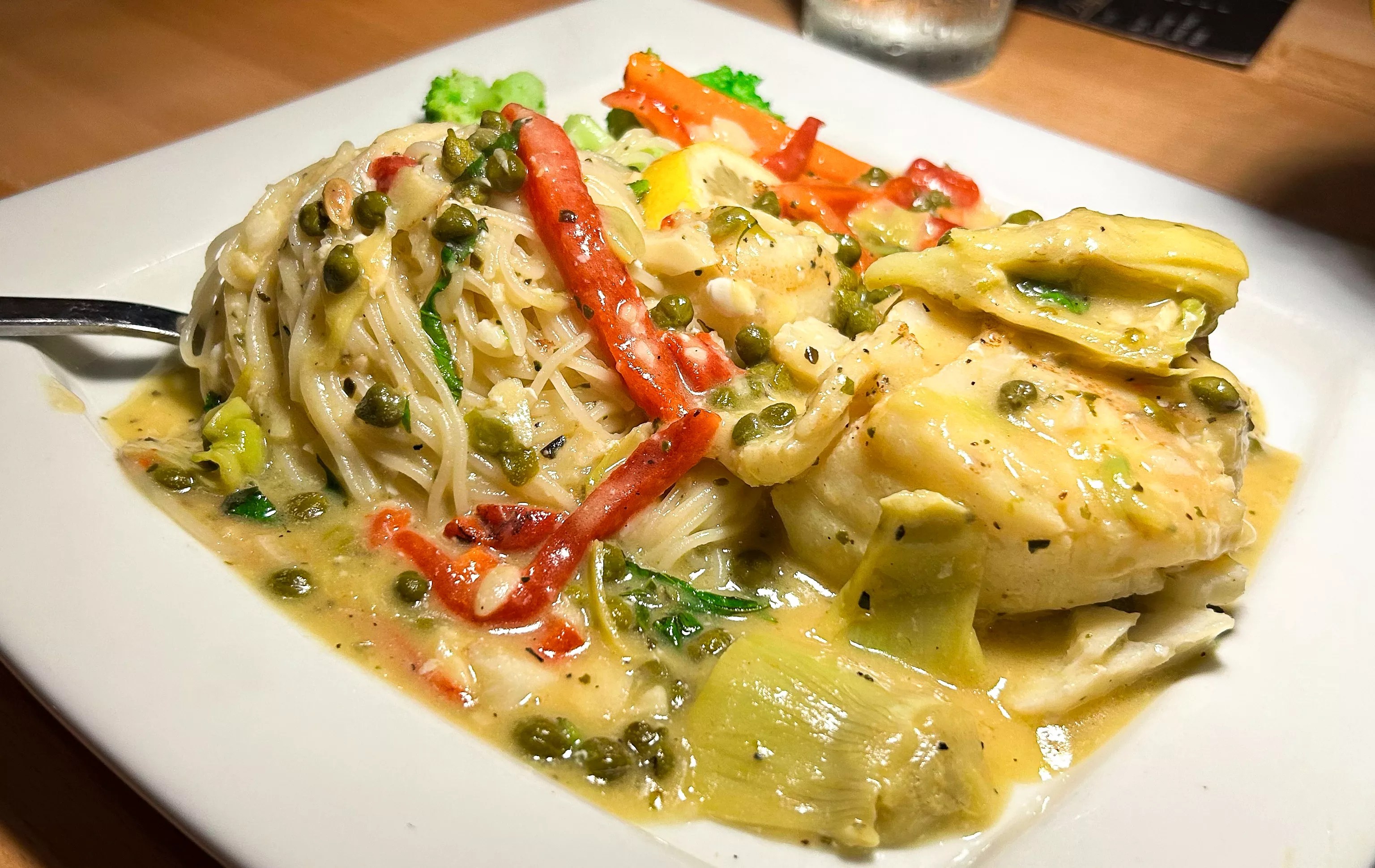 The Chef’s Favorite special ($26) was breaded chicken breast over pasta with red peppers and pepperoncini in a rich brandy cream sauce. The dish had a pronounced red pepper taste, which we loved, but if that isn’t your thing, the kitchen will happily make it without. Initially, the pepperoncini seemed like an odd choice, but it enhanced the dish.