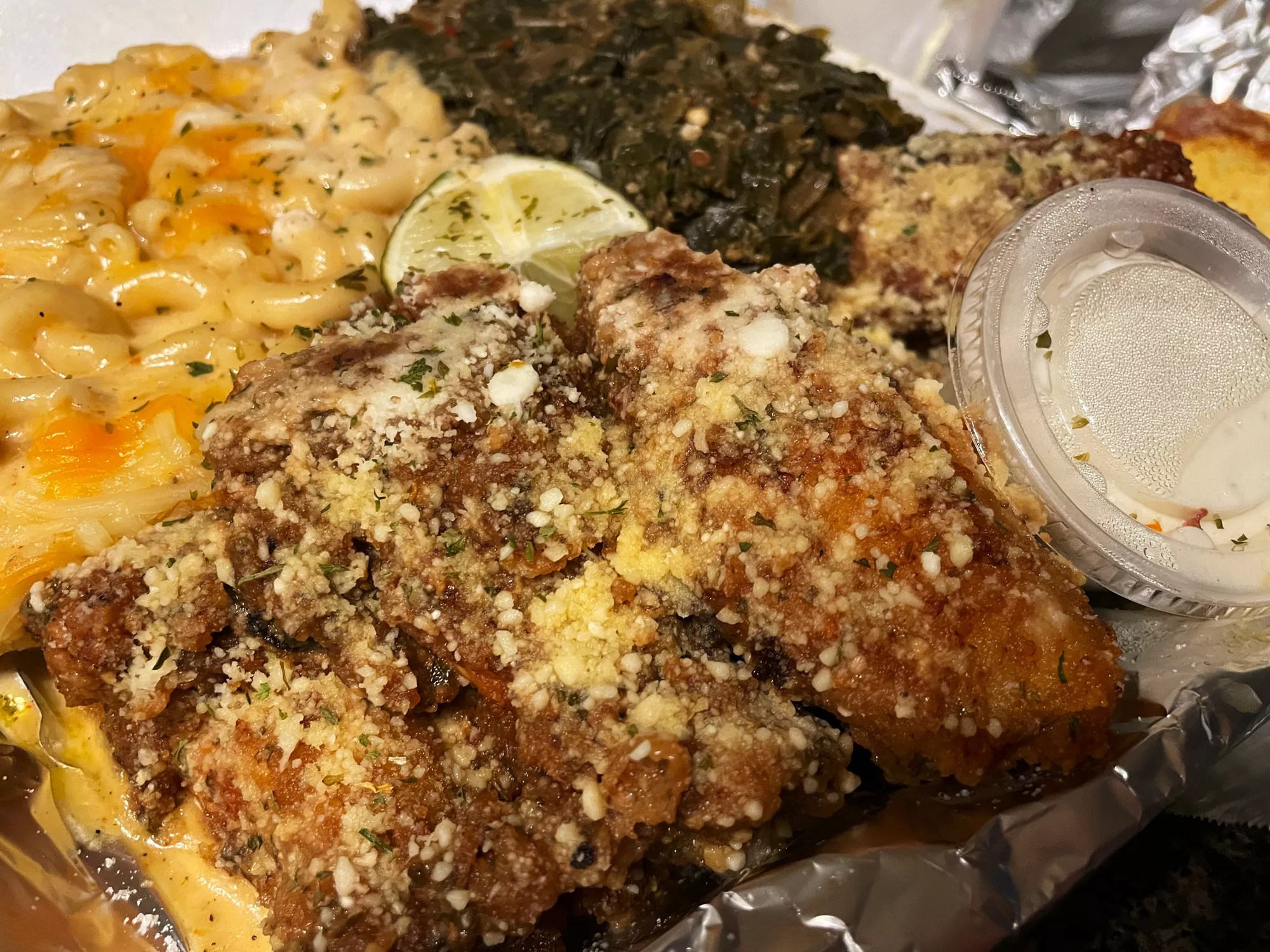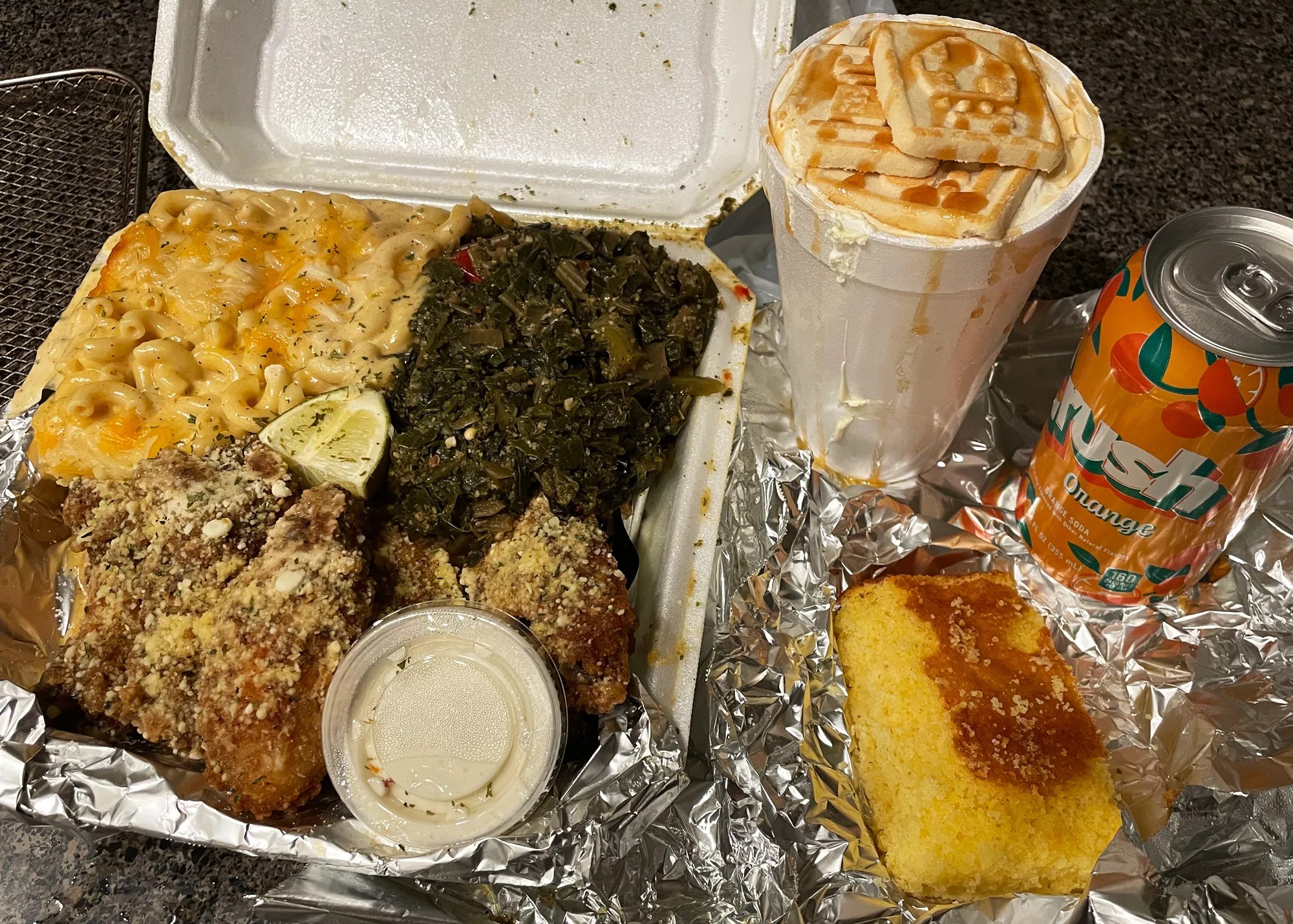 First, we need to talk about the gravitational pull of the bag the food comes in. We got lemon pepper wings, greens, mac n’ cheese, cornbread, banana pudding AND a drink. This could easily feed two people. For $35.