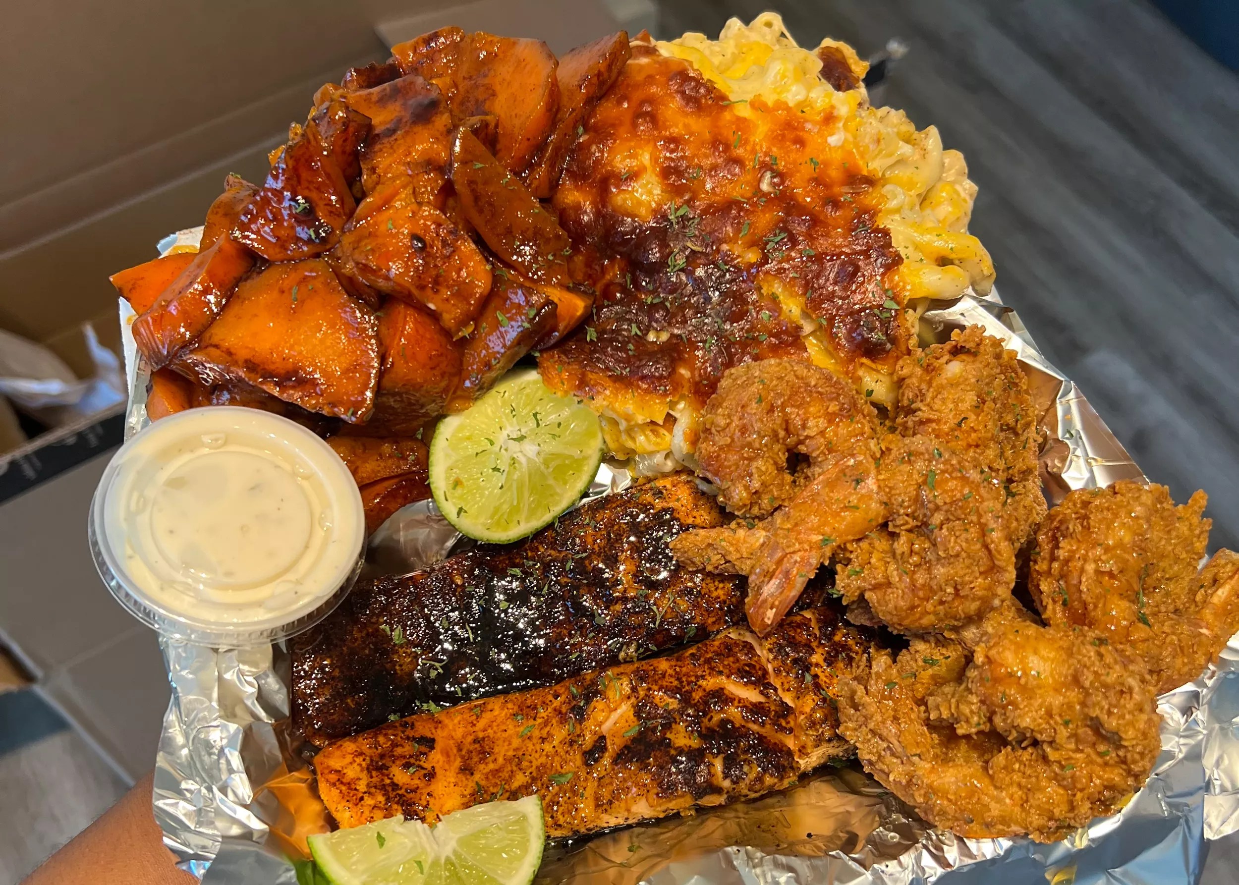 The plate in the video had a generous helping of saucy lemon pepper honey hot deep fried wings, a fat and loaded baked potato and a mountain of macaroni and cheese. The rest of the video shows a step-by-step guide for how the plate is assembled and advertises how one can get their hands on one of these bad boys.