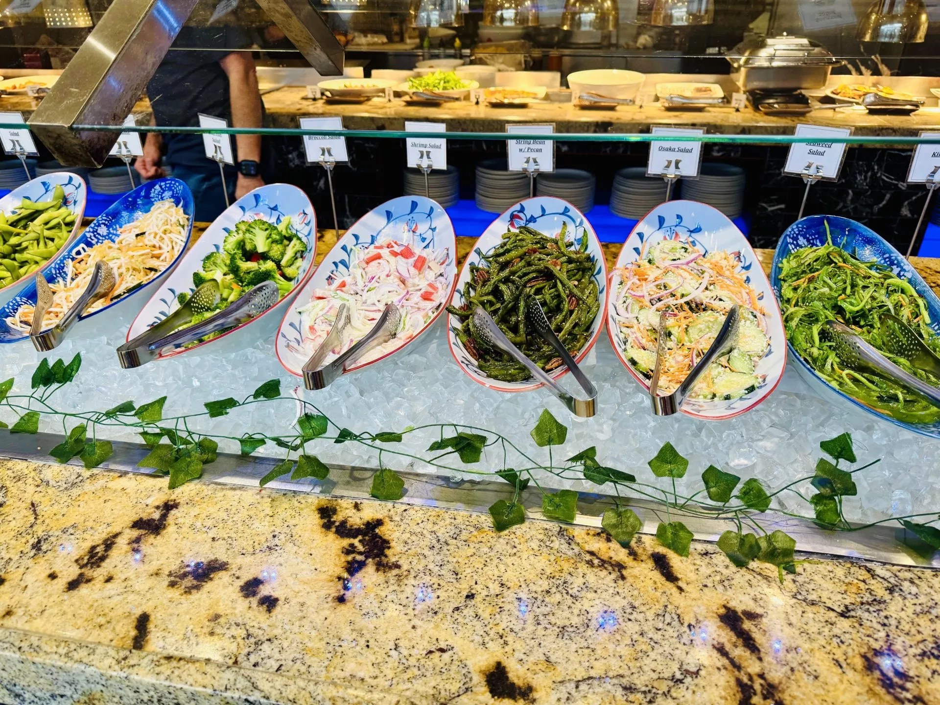 In addition to the sushi and sashimi, Osaka also offers hibachi. New York strip steaks, fried rice and noodles, Korean fried chicken, lamb chops, grilled salmon and white fish are all for the taking. And let us not forget the Korean barbecue short ribs, which we would have eaten a mountain of (ditto the baked mussels) if it weren’t for the abundance of other options we had to save room for. There’s also a ramen noodle bar, a hot pot station and several cold salad options