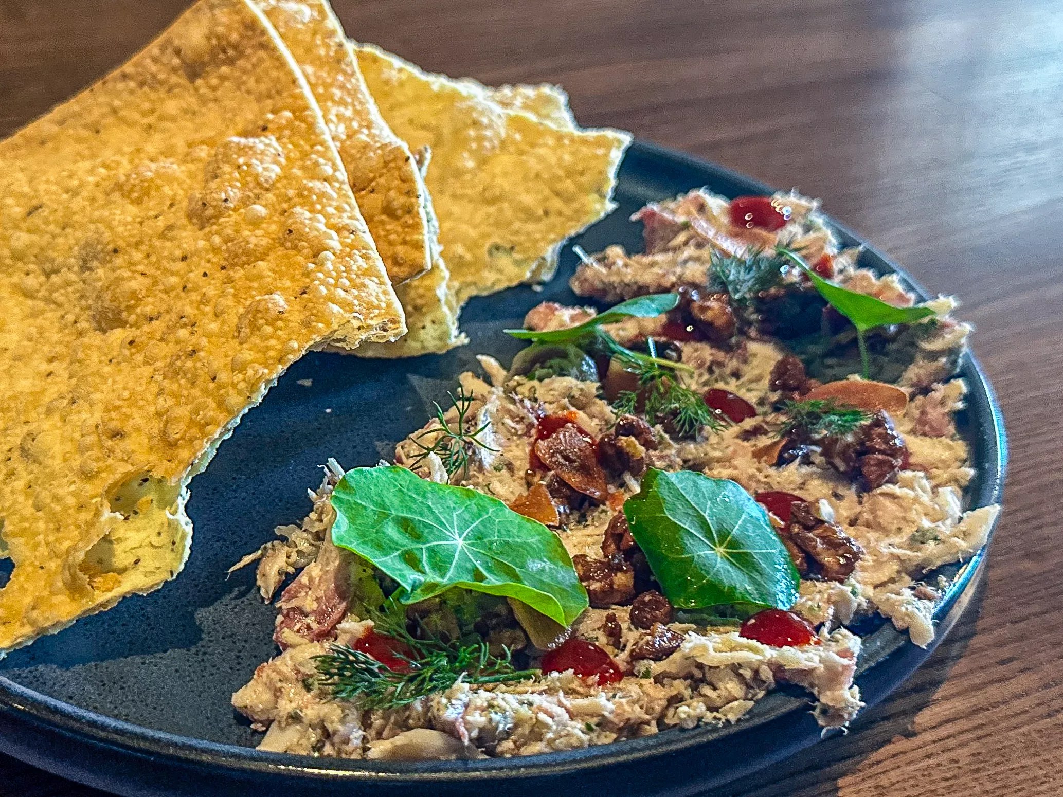 Our starter was the smoked redfish dip with dragee pecans and little dollops of candied hot sauce, which helped to counter some of the smokiness. This was dressed with fresh nasturtium and dill and served with large pieces of refrito celery seed chips for dipping.