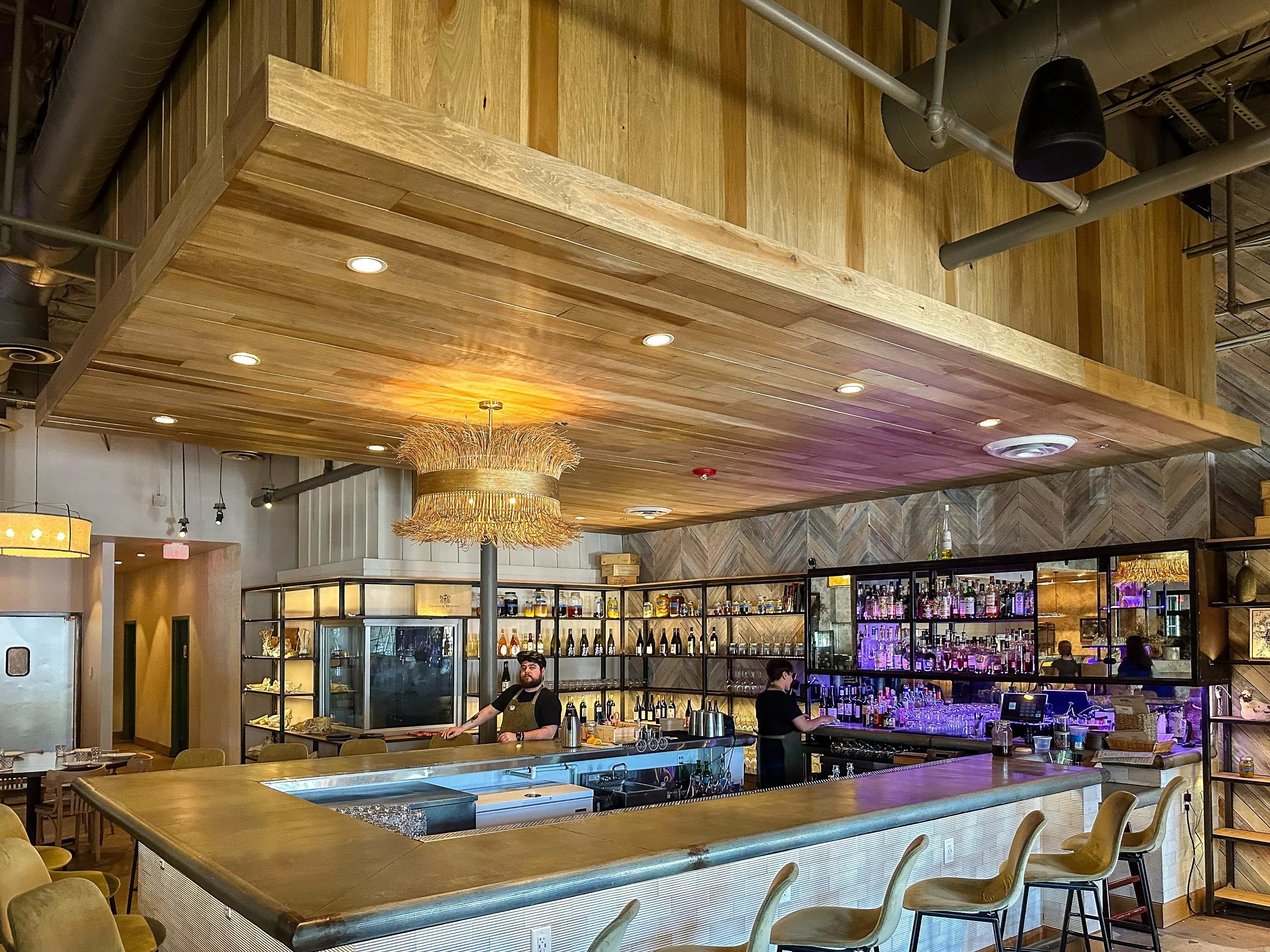 The space is much larger than the old location, with a large horseshoe bar on one side and several tables and booths on the other, along with a few seats at the counter that provide a close-up view of the goings-on of Norris and her staff in the kitchen and prep area. It’s not as eclectic in its décor as the old location with its sleeker and more modern look, but some touches did carry over, such as the collection of bones and animal skulls that line shelves like a Georgia O’Keeffe painting come to life.