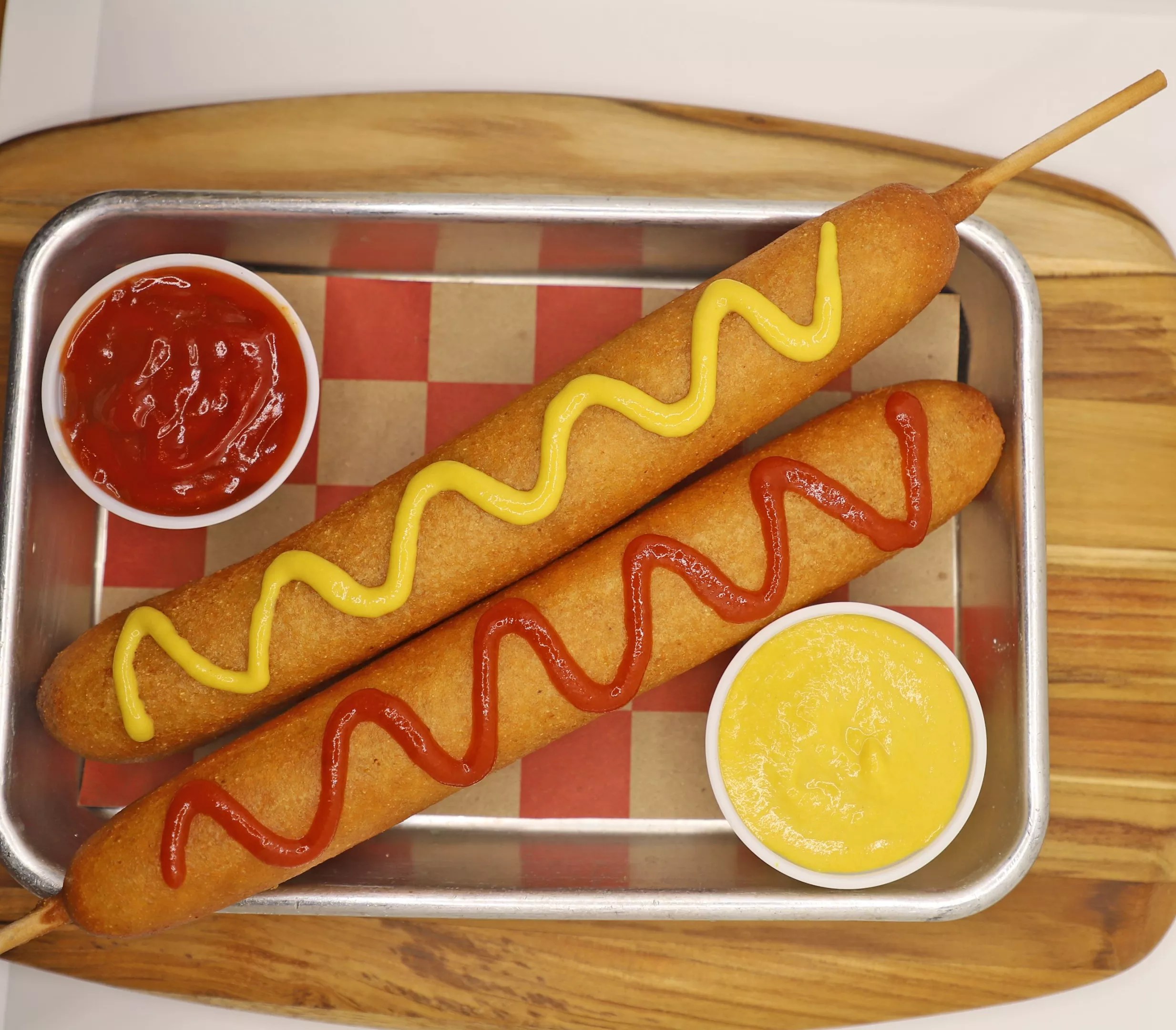 Foot-long corn dogs from Intrinsic are on the menu at Fair Fare on the Sqaure.