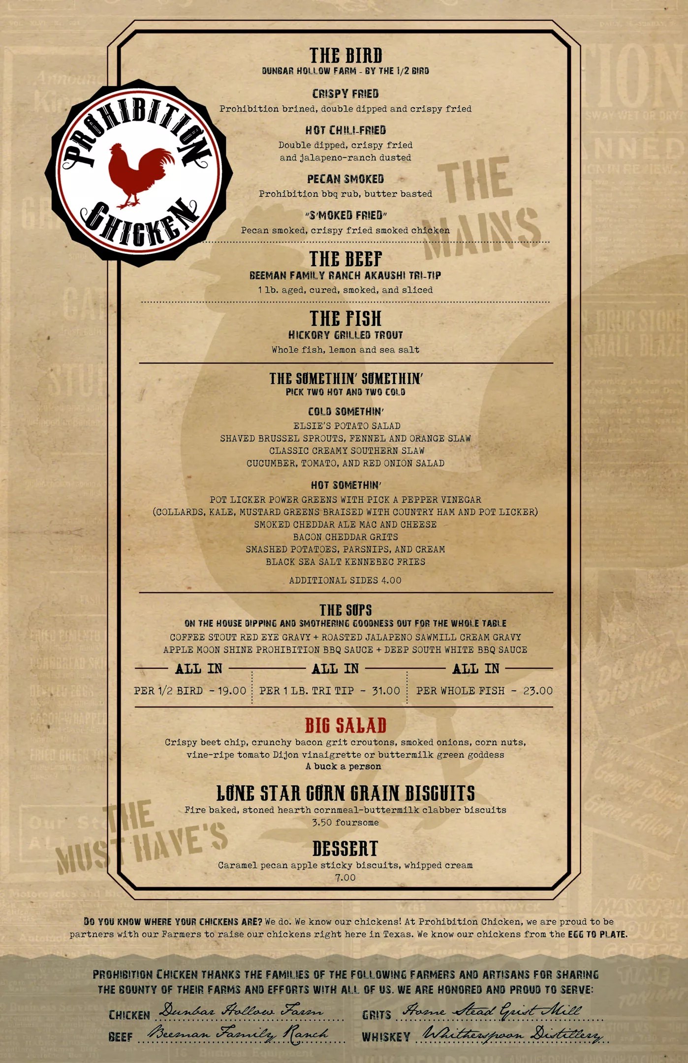 Streets Fine Kitchen. Fat Chicken. Farmbyrd. Chicken Moto. Whistle Britches. Fried chicken has officially ousted the wide umbrella of “Southern food” as the fastest-growing food trend in North Texas. Now, we have another: Prohibition Chicken, opening Tuesday, April 25 in Old Town Lewisville, according to a press release.