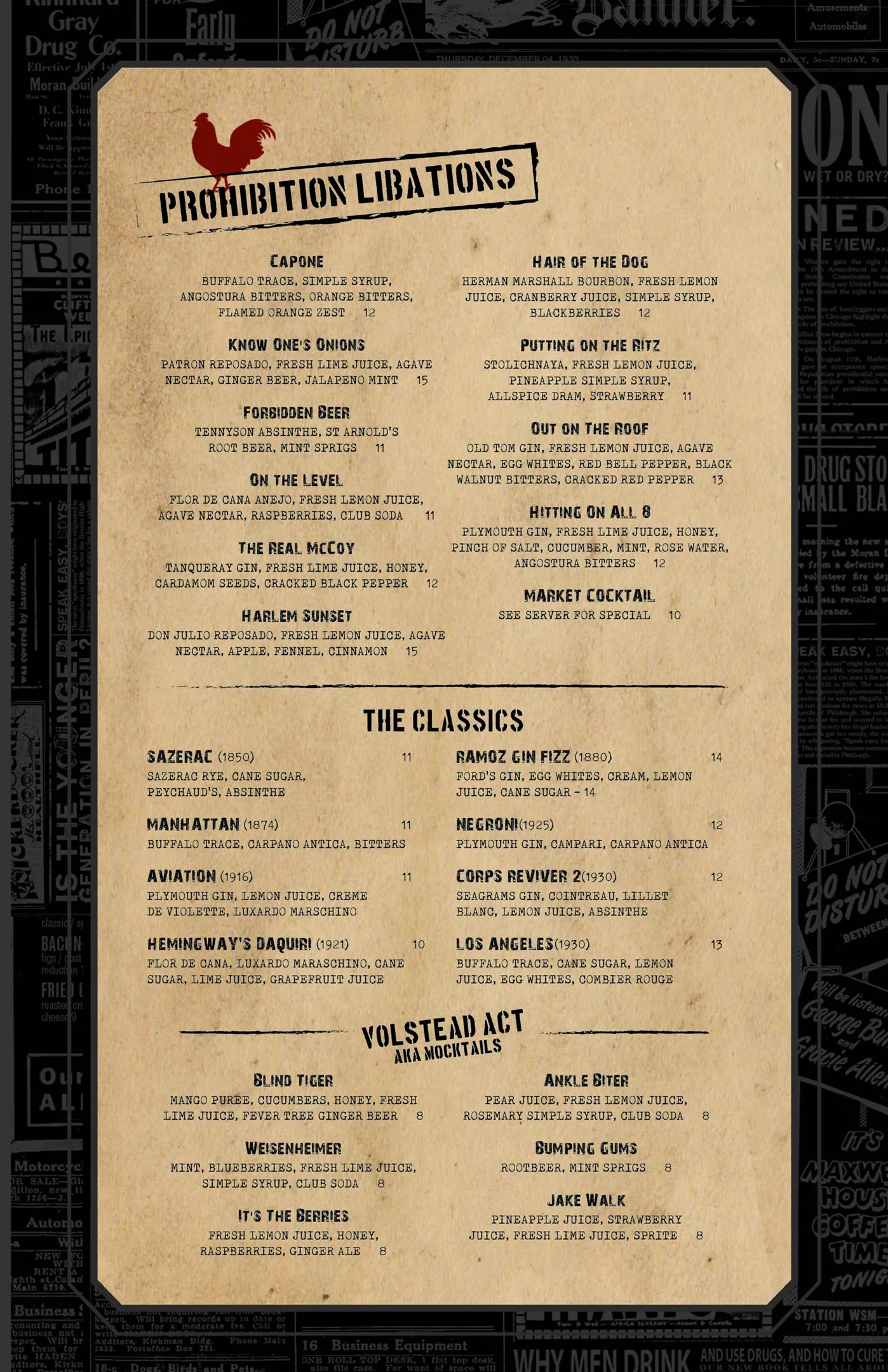 Prohibition Chicken’s cocktail menu. The restaurant’s bar will be stocked with 40+ whiskeys and ample scotch.