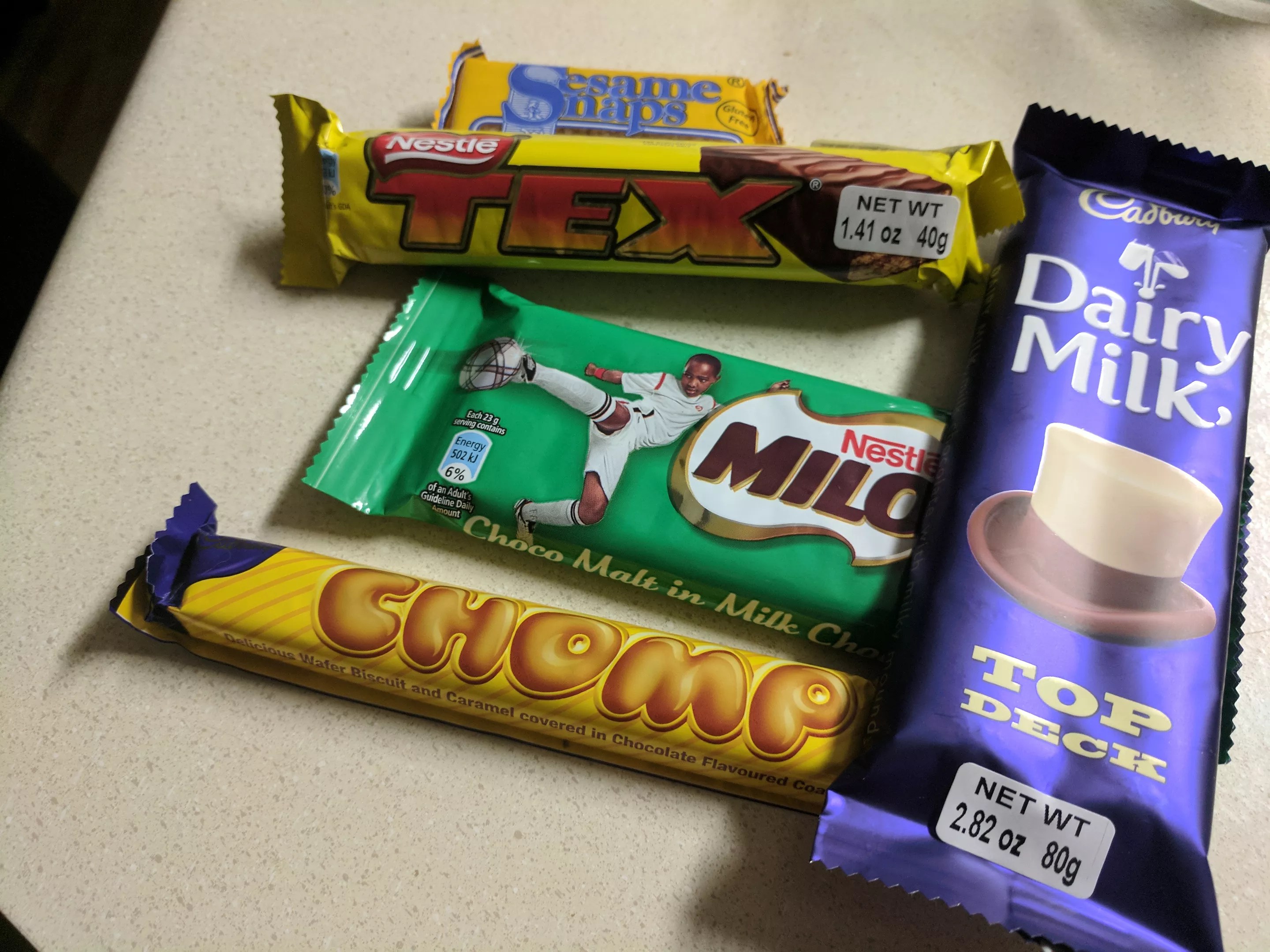 South African chocolate bars: Milo, Chomp, Tex and Cadbury’s Top Deck, which, tragically, is not in the shape of little top hats.