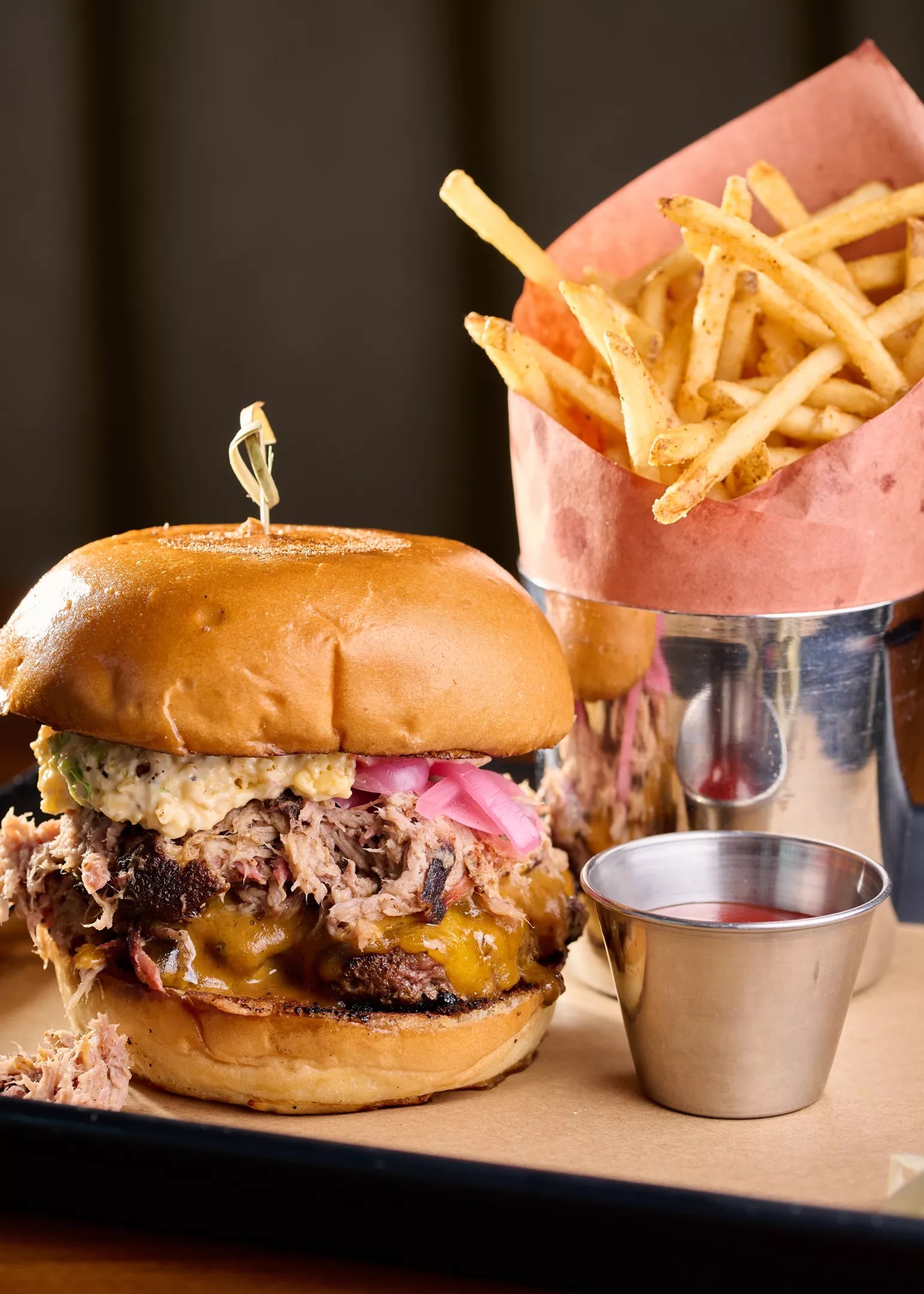 The BBQ Burger comes with pimento cheese and pulled pork.