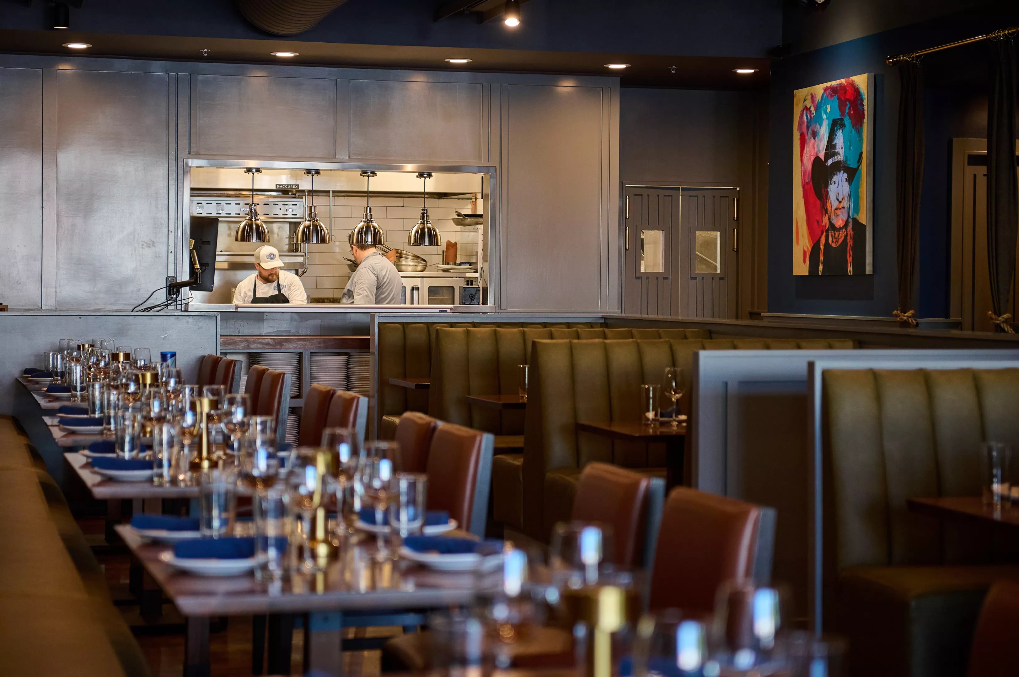 Inside, Douglas is not a large restaurant. The bar, heavy on wood and brass, sits directly ahead, with seating for no more than half a dozen or so. The dining room is split by a single aisle, with a banquet and tables one side, and half a dozen booths on the other. Decor is elegantly minimal, which keeps the feel cozy and classy.