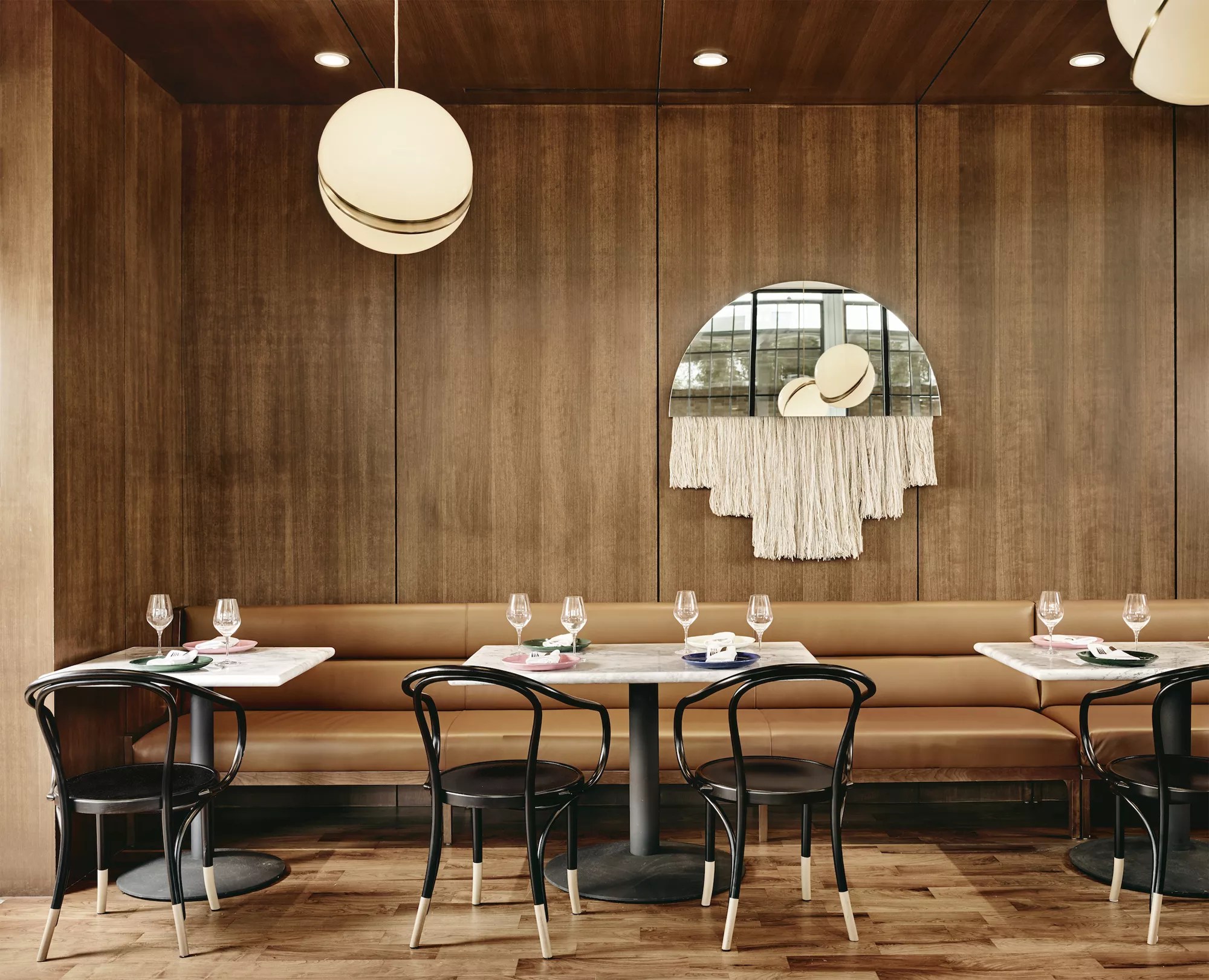 The restaurant, designed by Seattle-based architectural firm Olson Kundig, was created as “a contemporary take on romanticized European design and a subtle nod to Harry’s Bar in Venice,” which translates to an “all-day cafe for those looking for a full day of lingering or festive night out.”