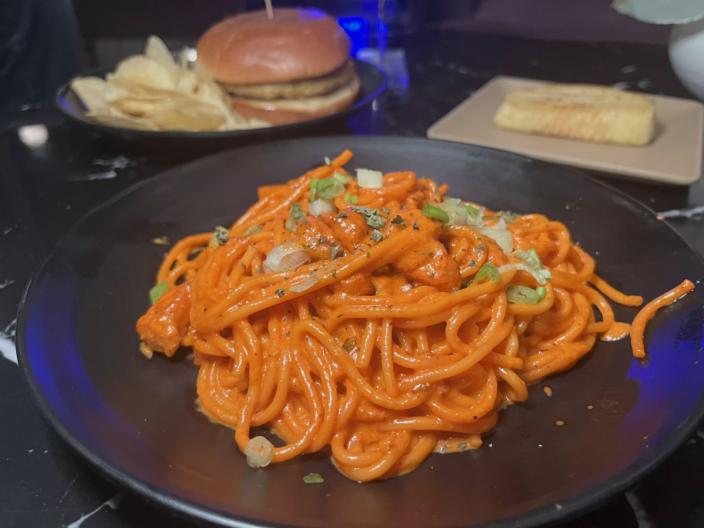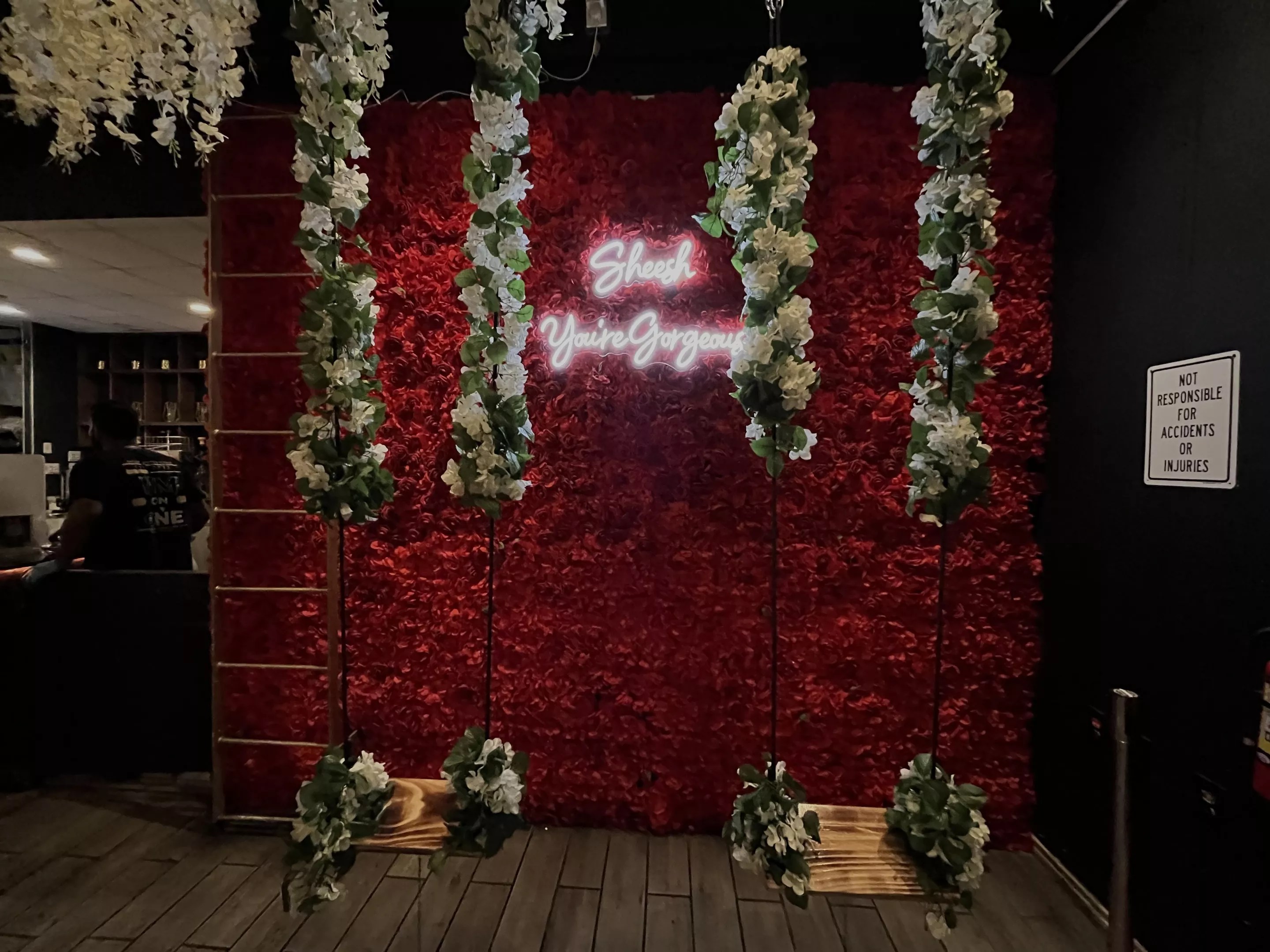 It is a relaxing space. The illuminated ‘Sheesh’ sign at the back beckons to photo enthusiasts, while various neon signs cast an extravagant glow on flower-adorned walls. Sleek ceiling globes impart a dim glow over the colorful lounge chairs scattered throughout the dining room.
