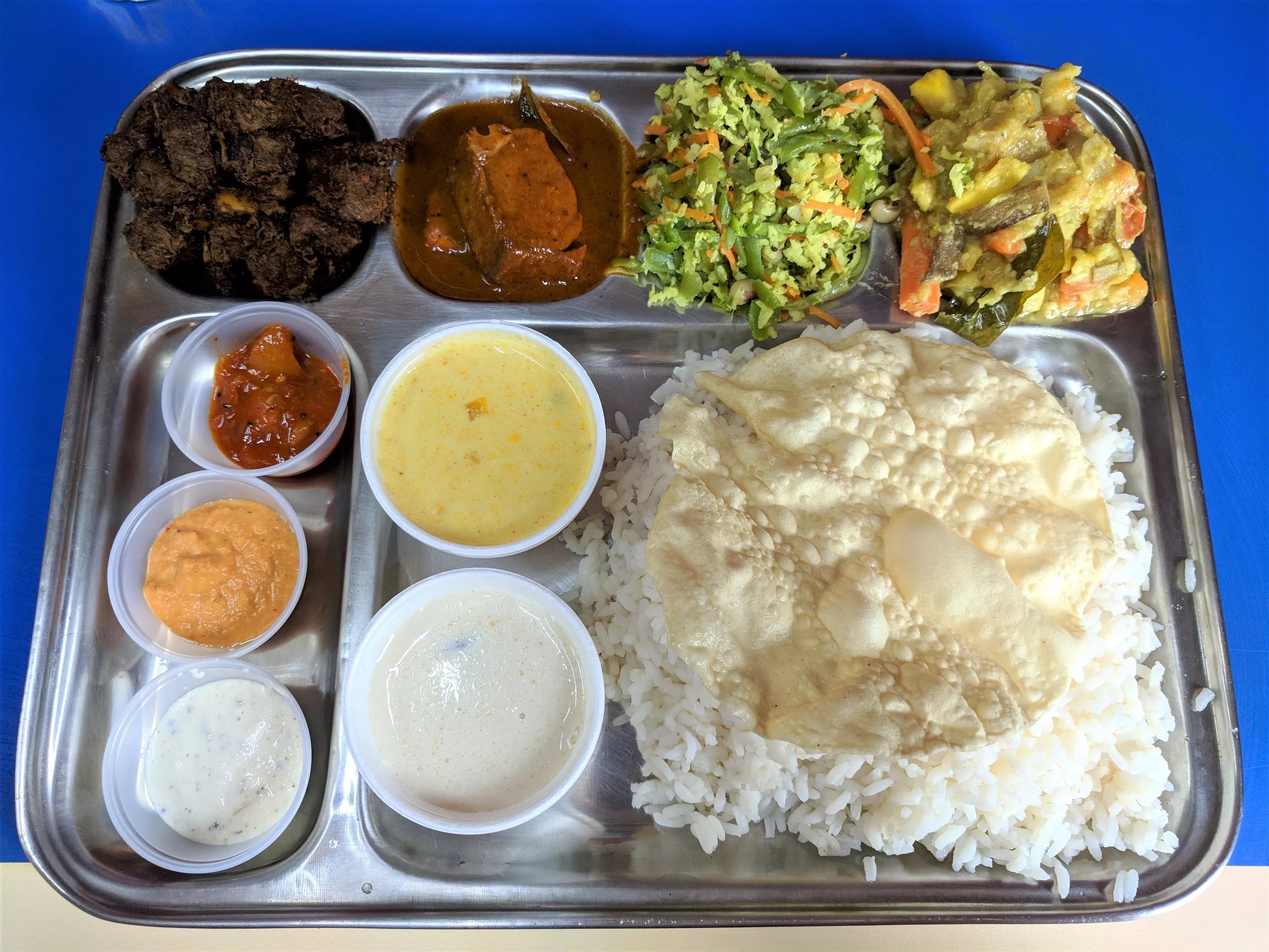 The daily special plate at Kerala Kitchen, featuring beef curry, fish curry, two vegetable curries, rice, pappadam and a variety of sauces and chutneys.