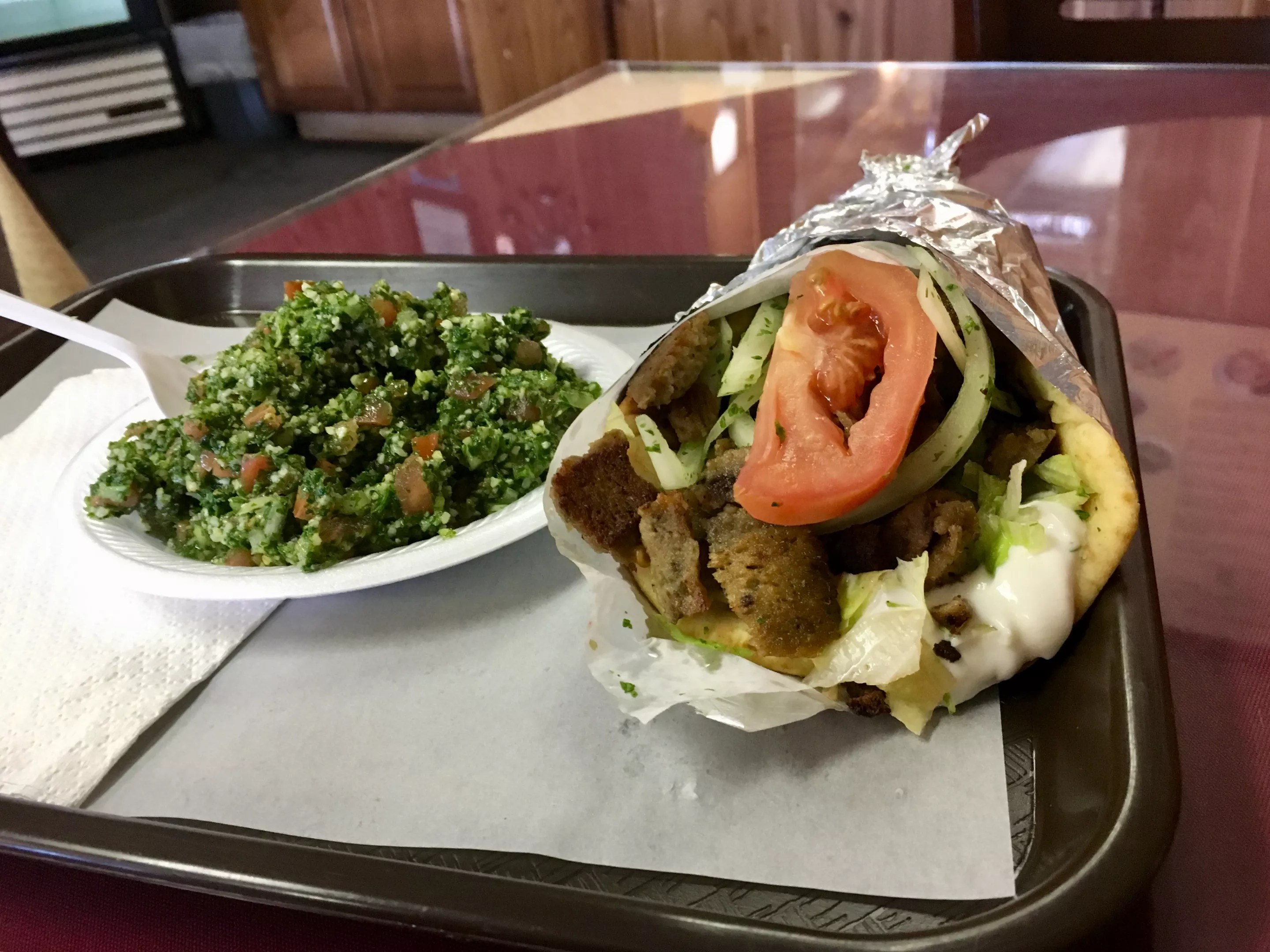Fattoush salad, nearly effervescent with lemon and parsley – you can feel the herbs cleaning the McDonald’s from your bloodstream as you eat – is served on a Styrofoam plate. A shaved lamb and beef gyro, the meat seared quickly on the flat grill, is wrapped in a pita, thick and lightly charred from a toaster. It’s the right mix of garlicky, toasty, creamy and salty. It’s simple, clean, delicious food.