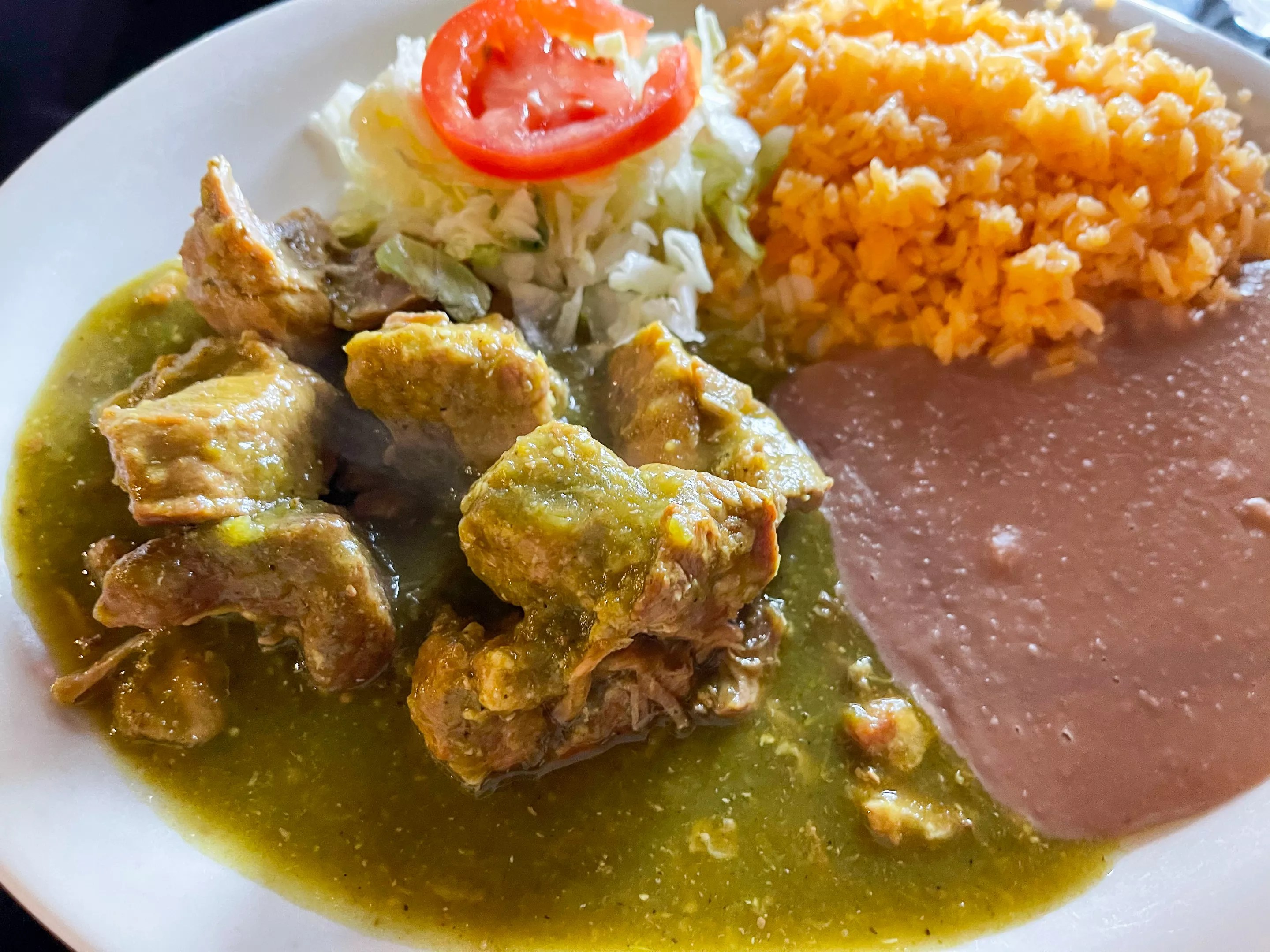 Chunks of pork are stewed with a spicy green chile sauce and served with rice and beans. Go ahead and order both corn and flour tortillas – they’re made in-house and fresh.
