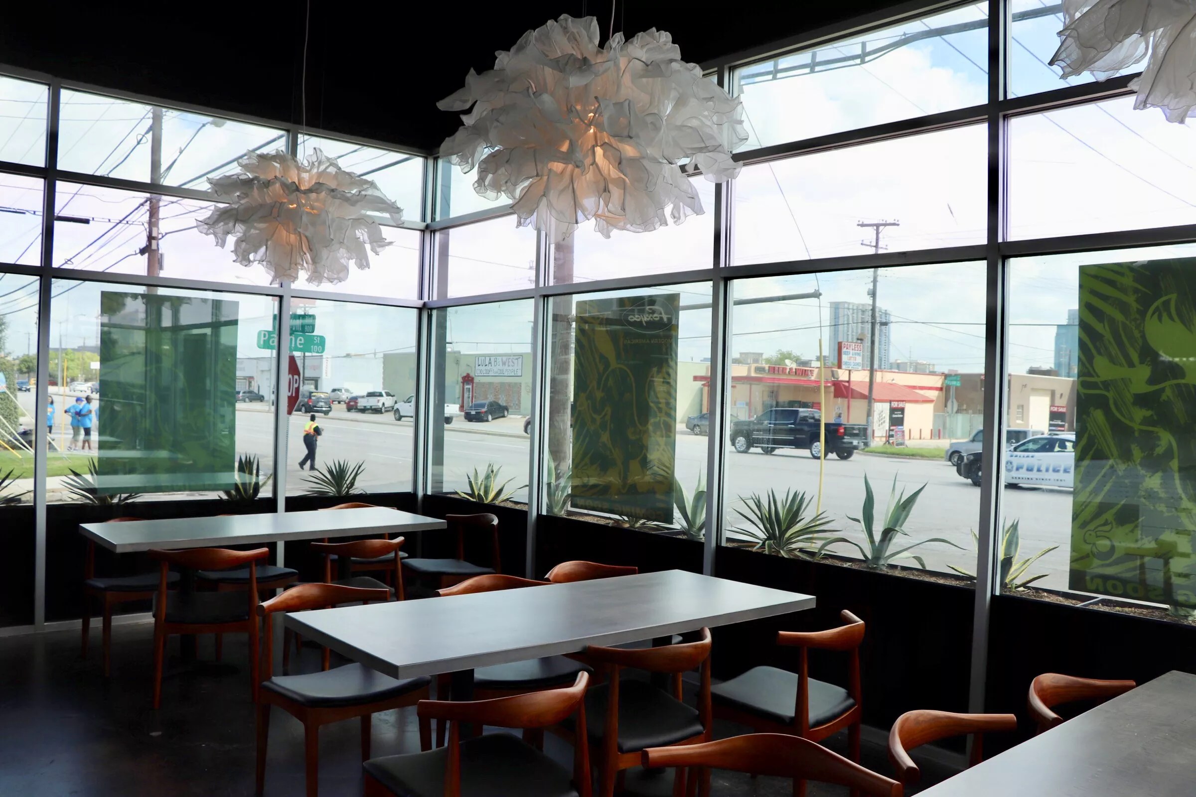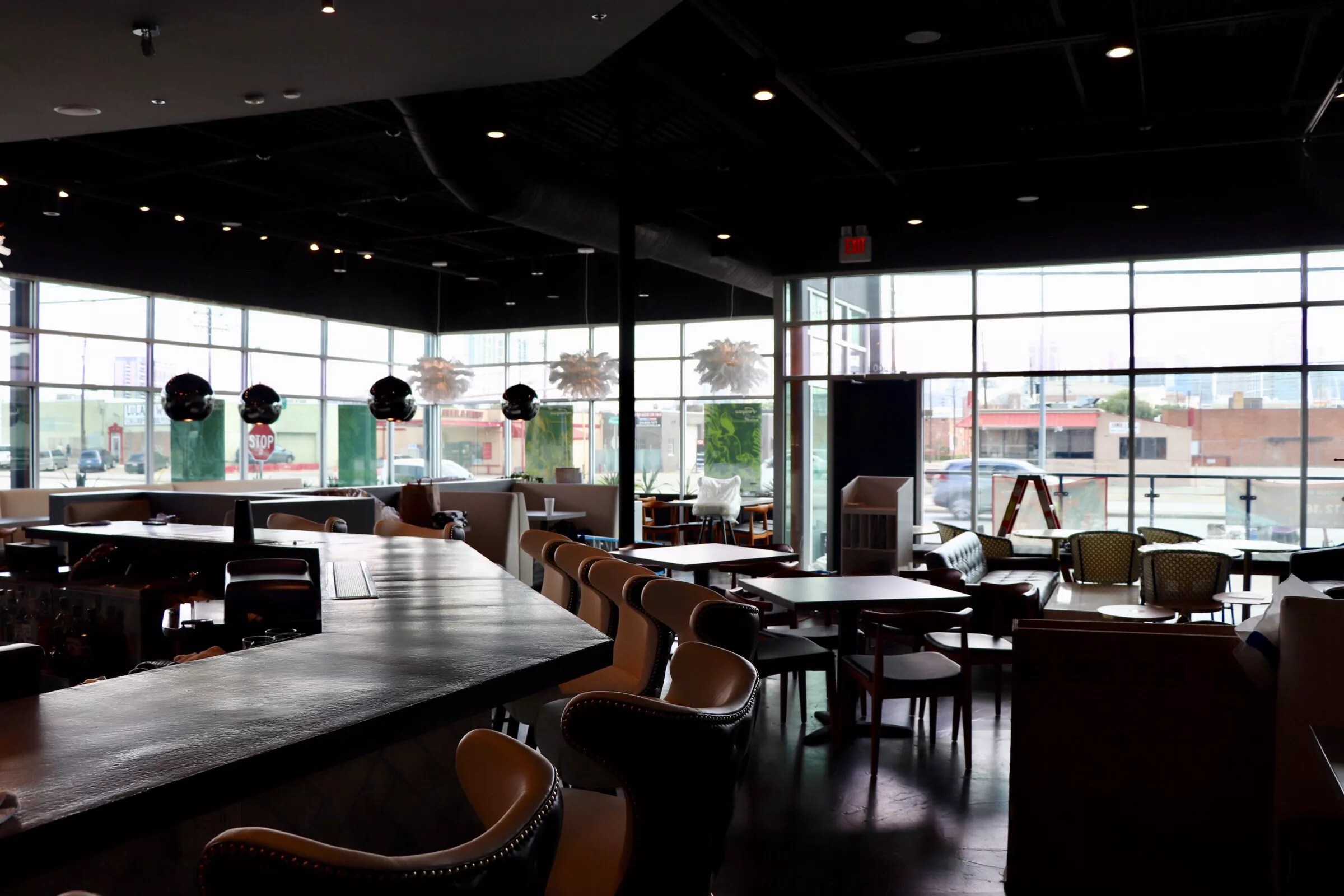 The space, lined with floor-to-ceiling windows on two sides and a Jackson Pollock-inspired splattered wall on another, will seat about 85.