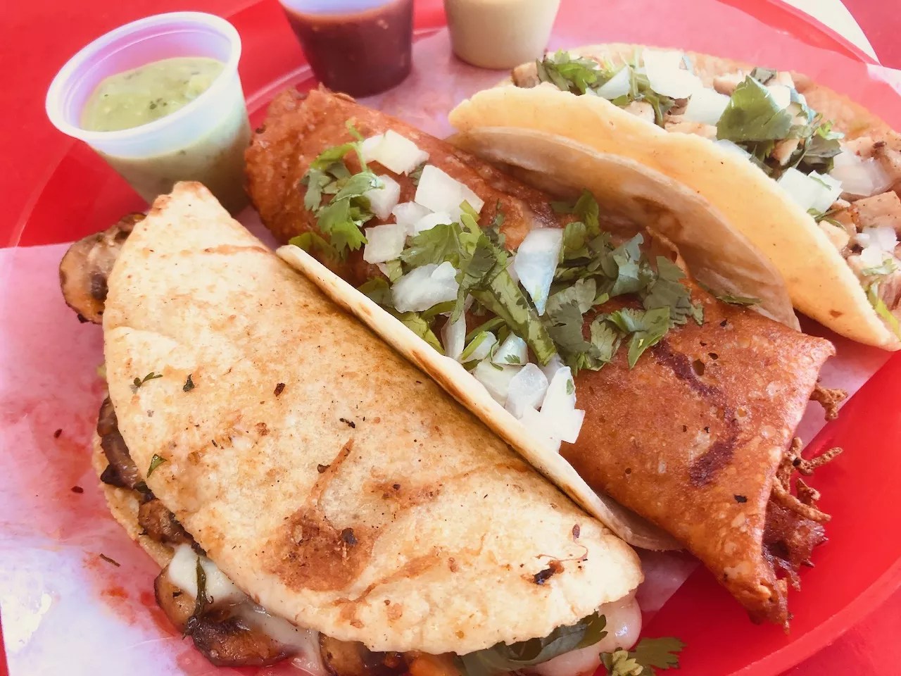 The tight menu has a section for tacos, quesadillas and sides (elotes or chips). For the fillings, you can get hongos (caramelized mushrooms), carne asada, pastor, campechano, barbacoa or pollo. Those are your basics and what’s on the menu.