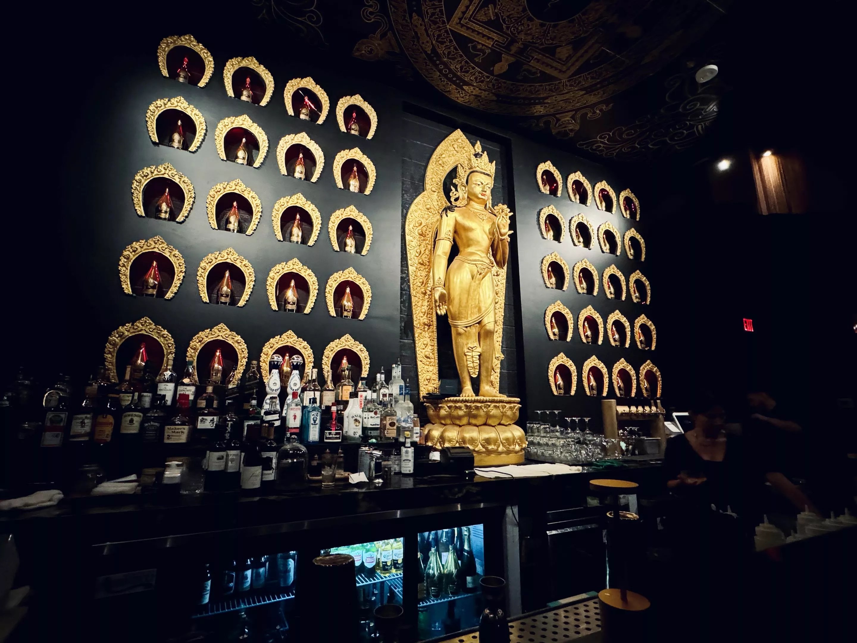 On another night we wound our way to the speakeasy in the back, cozy and dark, the opposite of the bright restaurant in front. There’s more art sourced from Nepal, including large tiles hovering over the bar and a stunning gold Buddha statue holding court at the center stage.