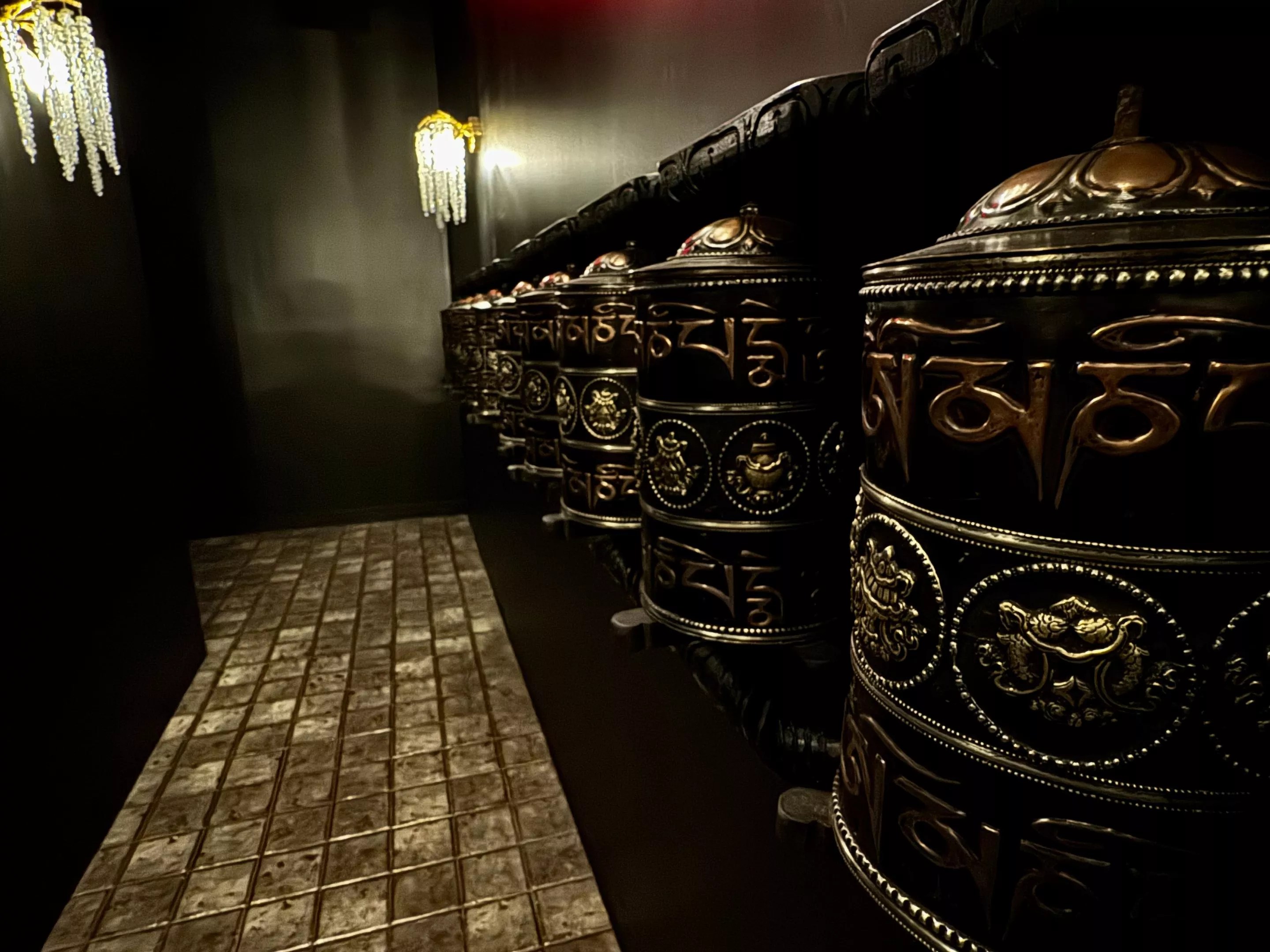 There are no signs above the door, or outside the restaurant for that matter, announcing the large bar behind the restaurant. But walking through the double door from Nepal you’ll see a dim hallway lined with Buddhist prayer wheels, also shipped from Nepal. Spin the wheels for wisdom and good karma, or a nice cocktail at least.