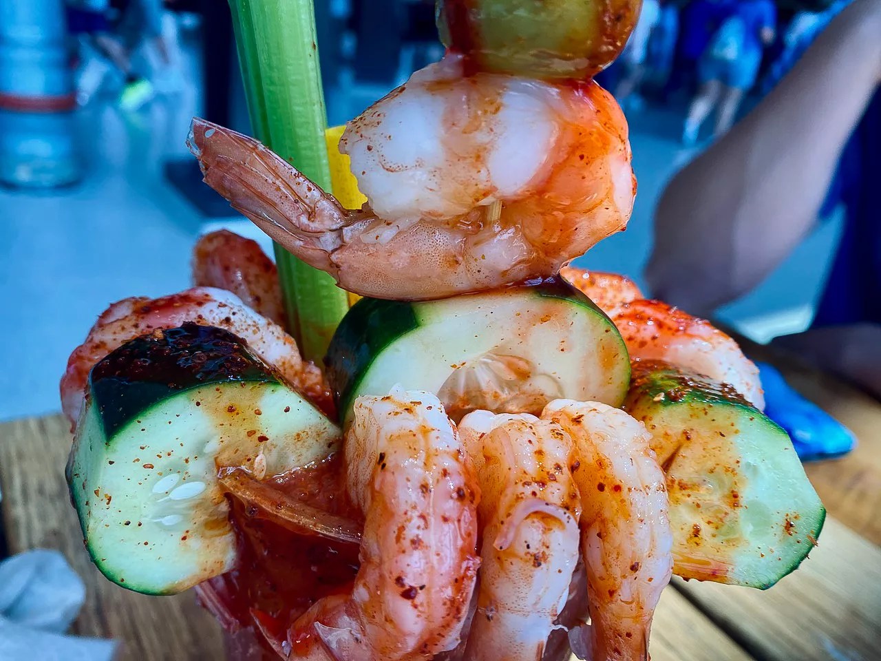 And instead of a cheeseburger and bacon lashed to the top of these drinks, eight boiled jumbo shrimp, cucumbers and celery, along with a sweet and spicy tamarind straw, stick out from the top.