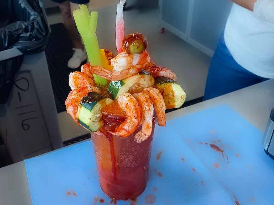 And instead of a cheeseburger and bacon lashed to the top of these drinks, eight boiled jumbo shrimp, cucumbers and celery, along with a sweet and spicy tamarind straw, stick out from the top.