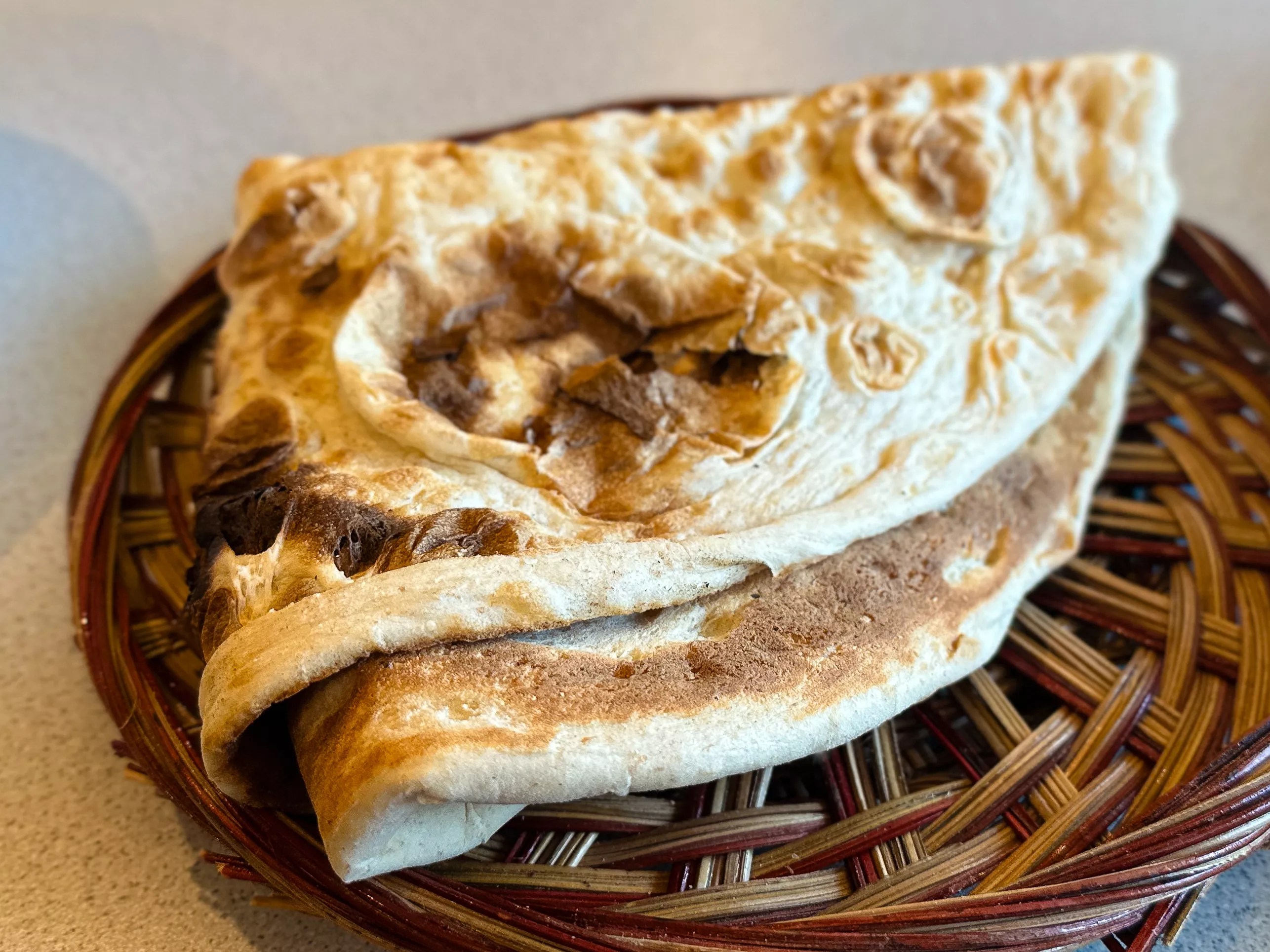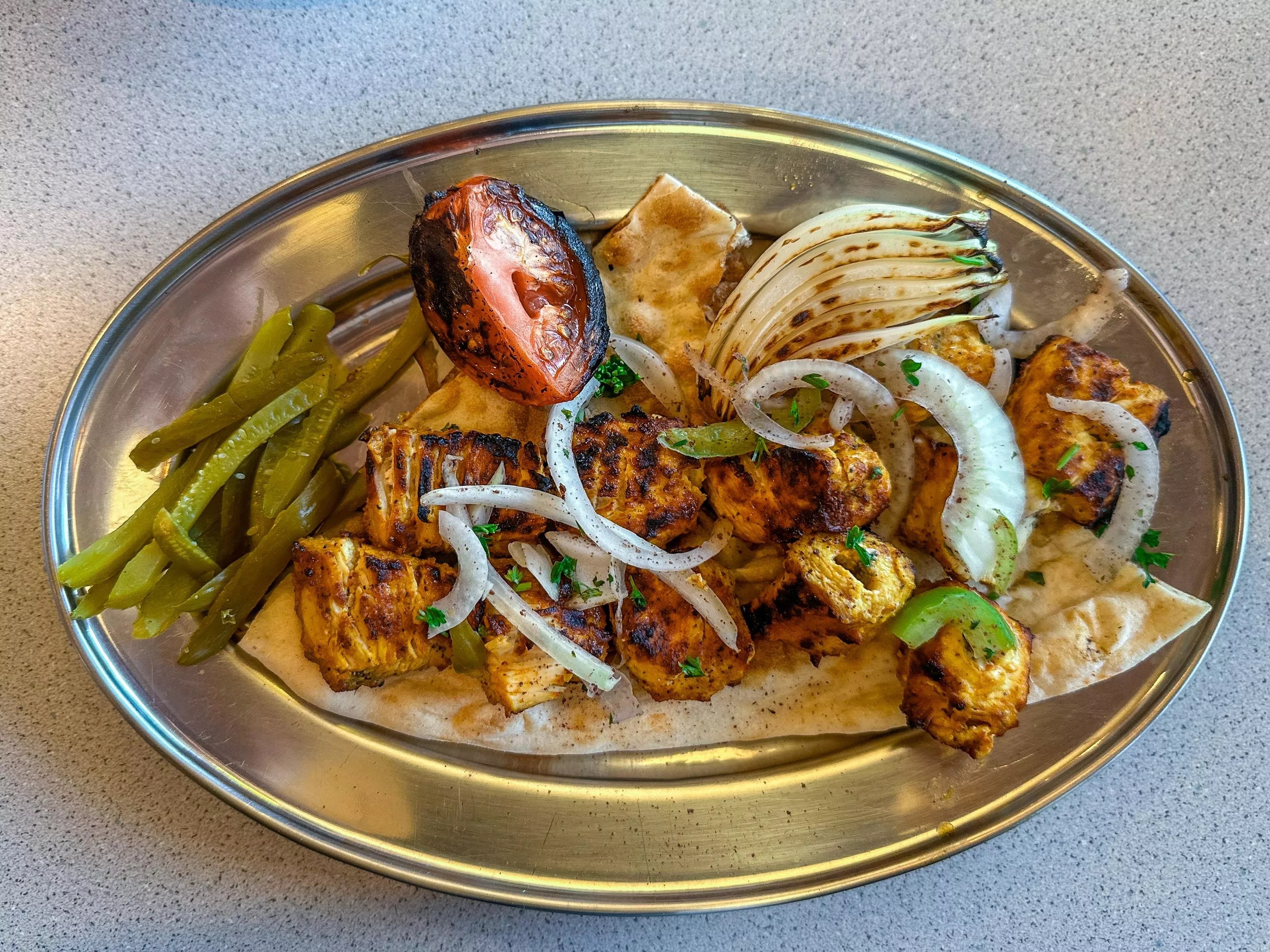 Several plates come with large bread or two sammon (a smaller yeast bread), grilled tomatoes and onions as well as pickles and rice or fries to accompany four skewers; half orders are also available. We went with a half order of shish tawook with rice, made with chunks of chicken in a yogurt-based marinade with lemon, garlic and ginger. These were perfectly grilled over a charcoal stove and came with a plethora of grilled onions, thinly sliced pickles and a charred tomato. The star of the presentation, however, was the extremely large tandoor-cooked bread that probably was the size of a manhole cover had it been unfolded.