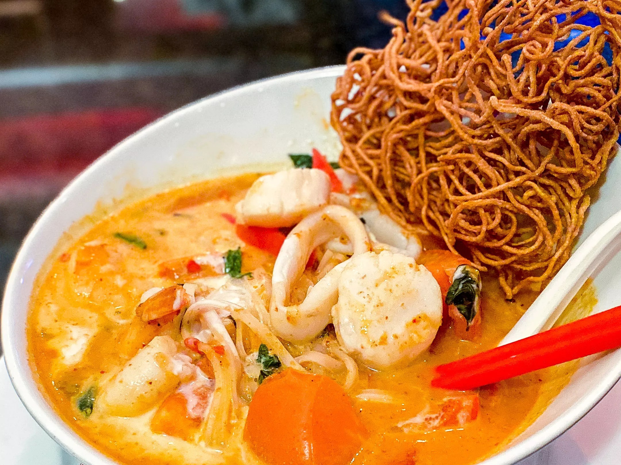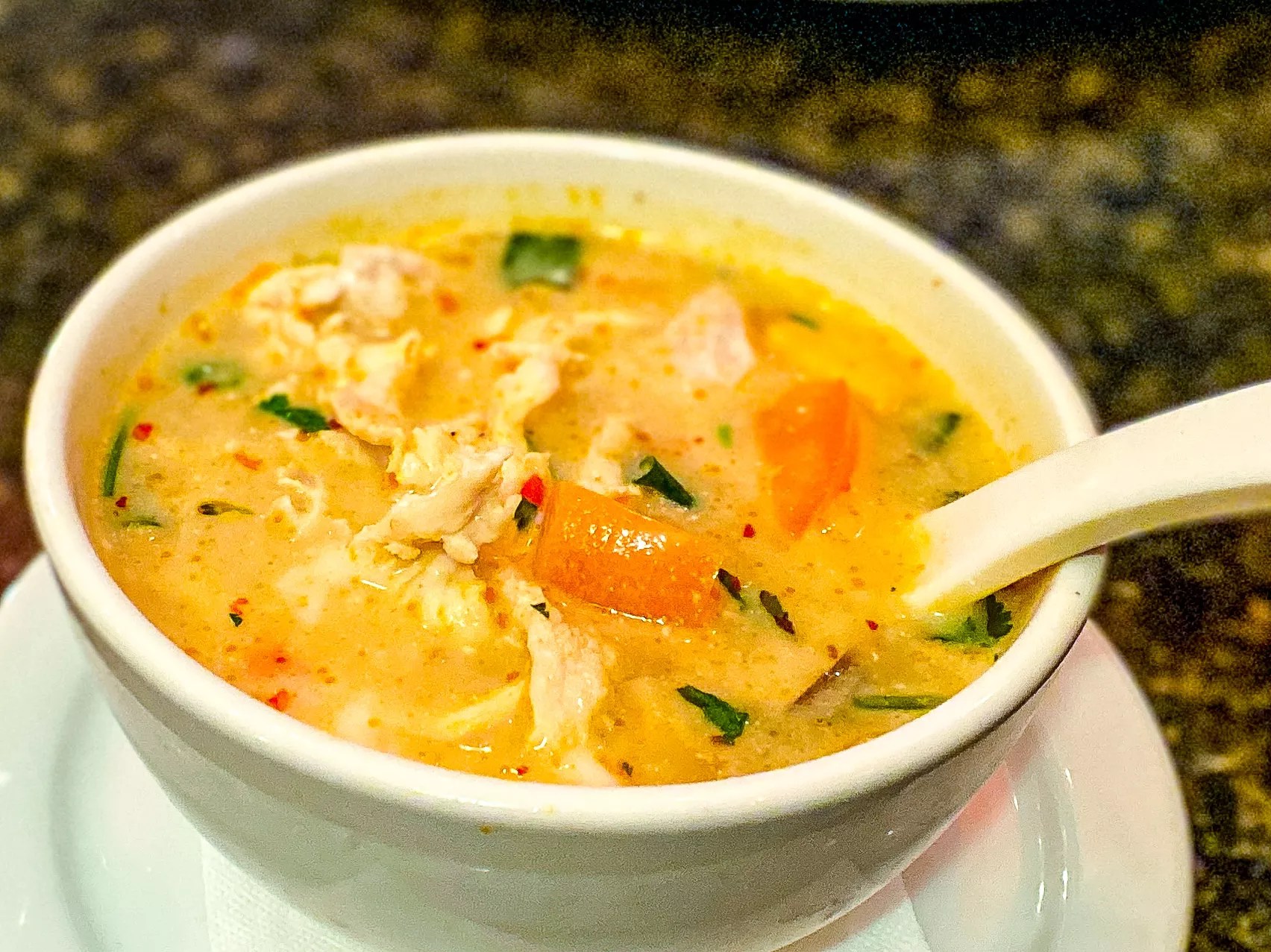 Tom kha soup with chicken comes with a spicy coconut broth.