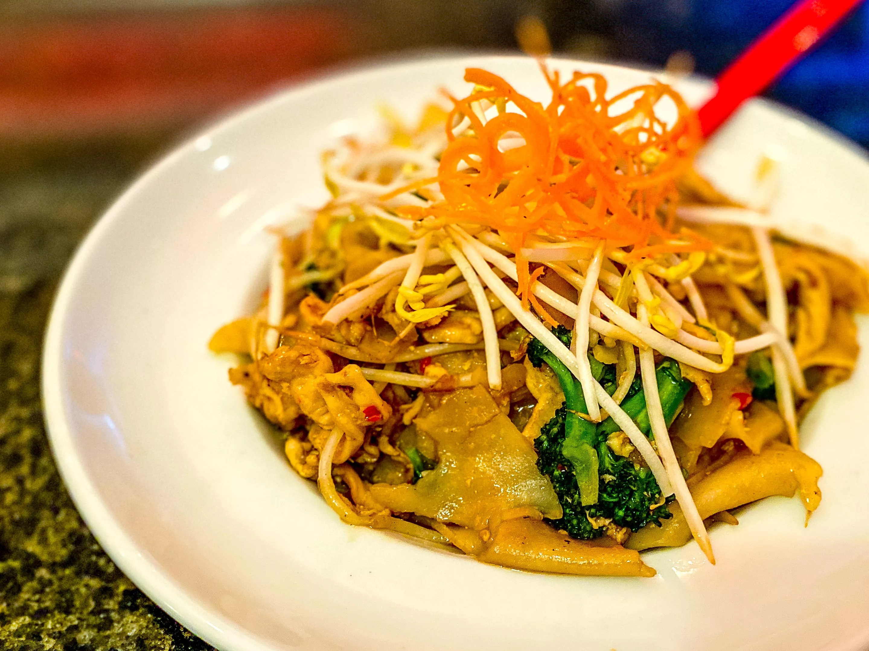 Pad see lew bringsrice noodles, egg, gai lan, broccoli and bok choi with bean sprouts in a brown sauce.