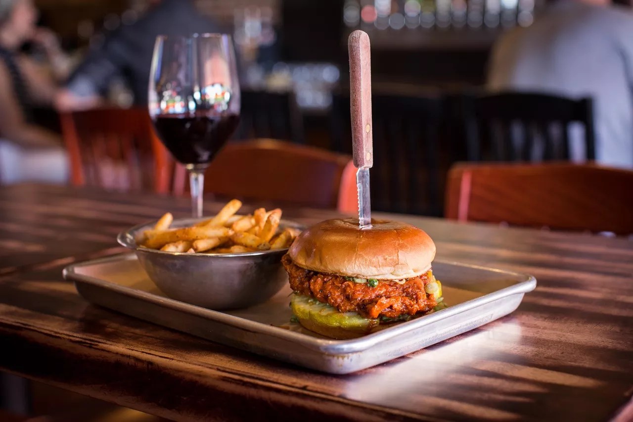 Chef Nathan Tate has a black belt in balancing creamy and acidic things. Chicken thighs lounge in pickle juice for about a day. After the pickle bath, they get dunked in another soak in buttermilk that’s dotted with hot sauce. The marinated thighs run through a dry blend of flour, salt, their own barbecue seasonings and into the deep fryer it goes. Buffalo sauce clings to every nook and crunchy cranny of the fried armor. That sauce is bright and sweet – it’s got the kind of heat (from Sichuan-style mala sauce and peppercorns) that glows outward from the center of your chest. Iceberg lettuce, dill pickles, grassy scallions and a herb-forward ranch dressing are a cool breeze. It’s all a balancing act between a bun.