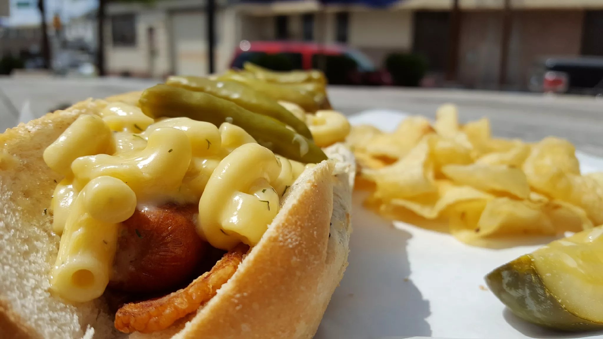 It’s rare to find a foot long dog in Dallas these days. This one’s topped with mac and cheese for .