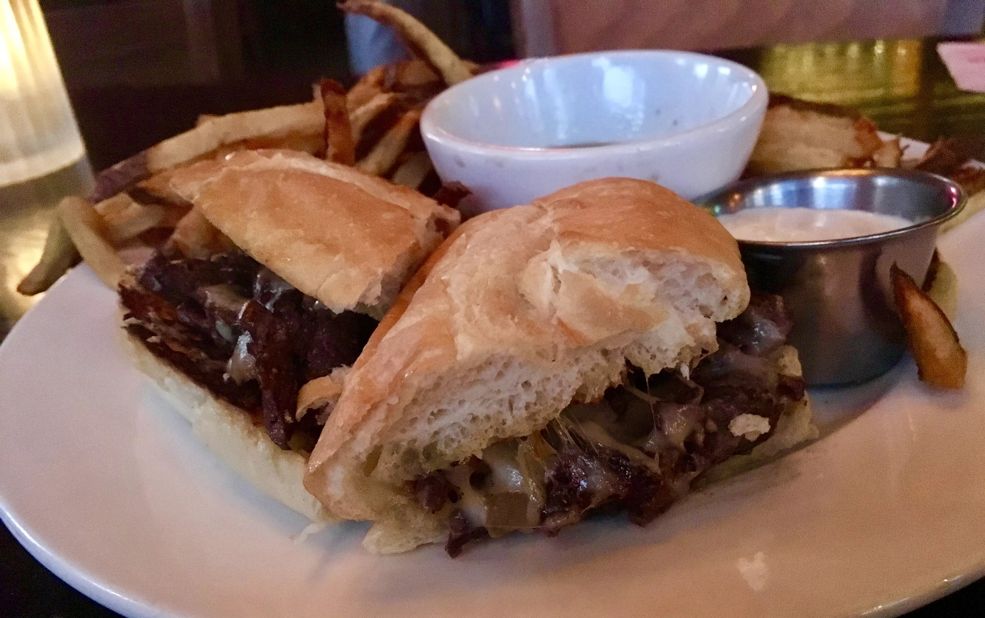 The hanger steak sandwich at Libertine has melted Gruyere cheese and jus for dipping ( with fries).