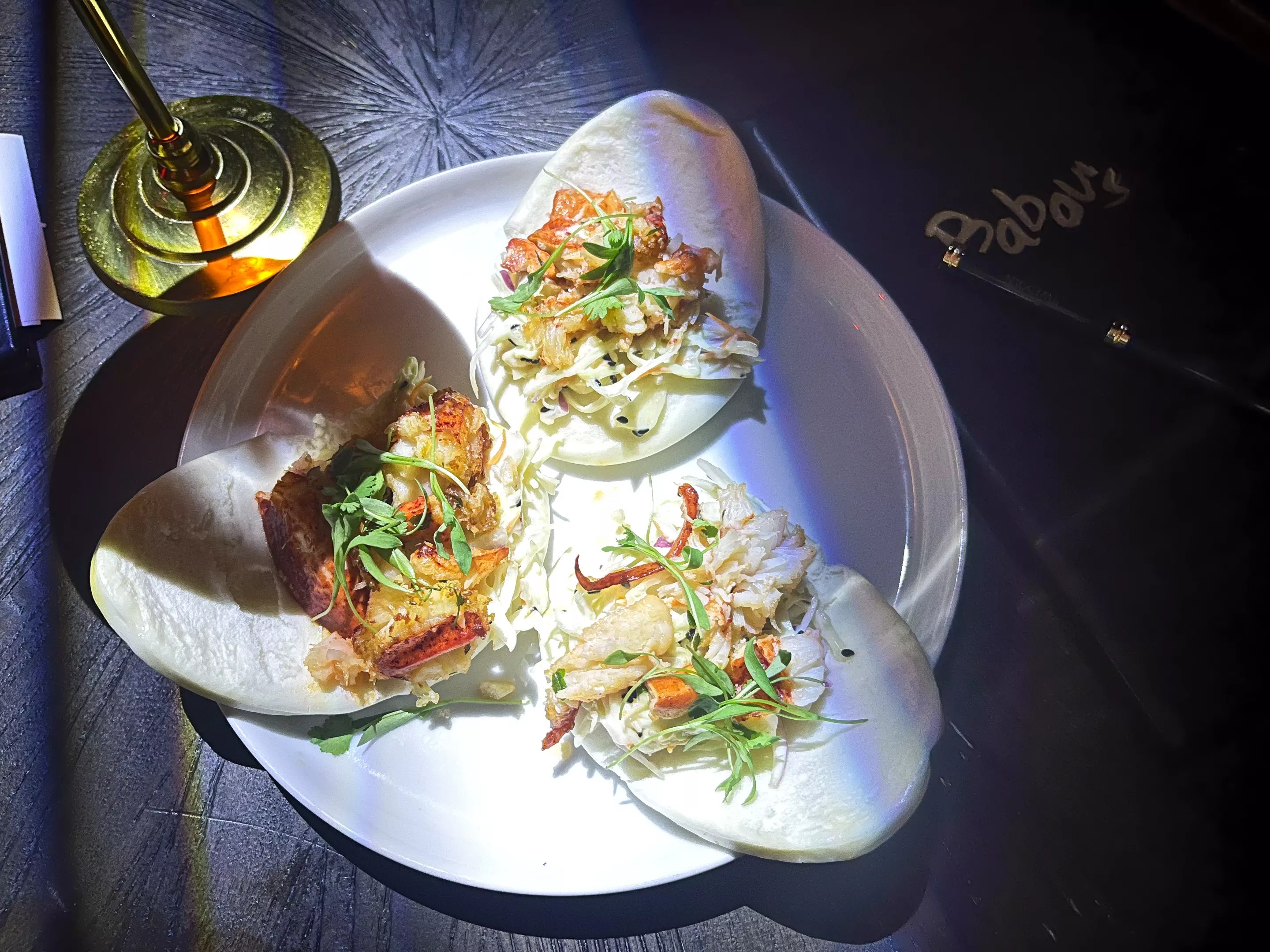 The sesame slaw, chili and miso-dressed lobster steam buns were our bite of choice. Three bao bun style bases are stacked generously with lobster and the fixings. If you’re looking for a light choice to whet your palate, the slaw and mild flavors are a go-to. Otherwise, the greasy counterparts make an ideal landing pad for your buzz.