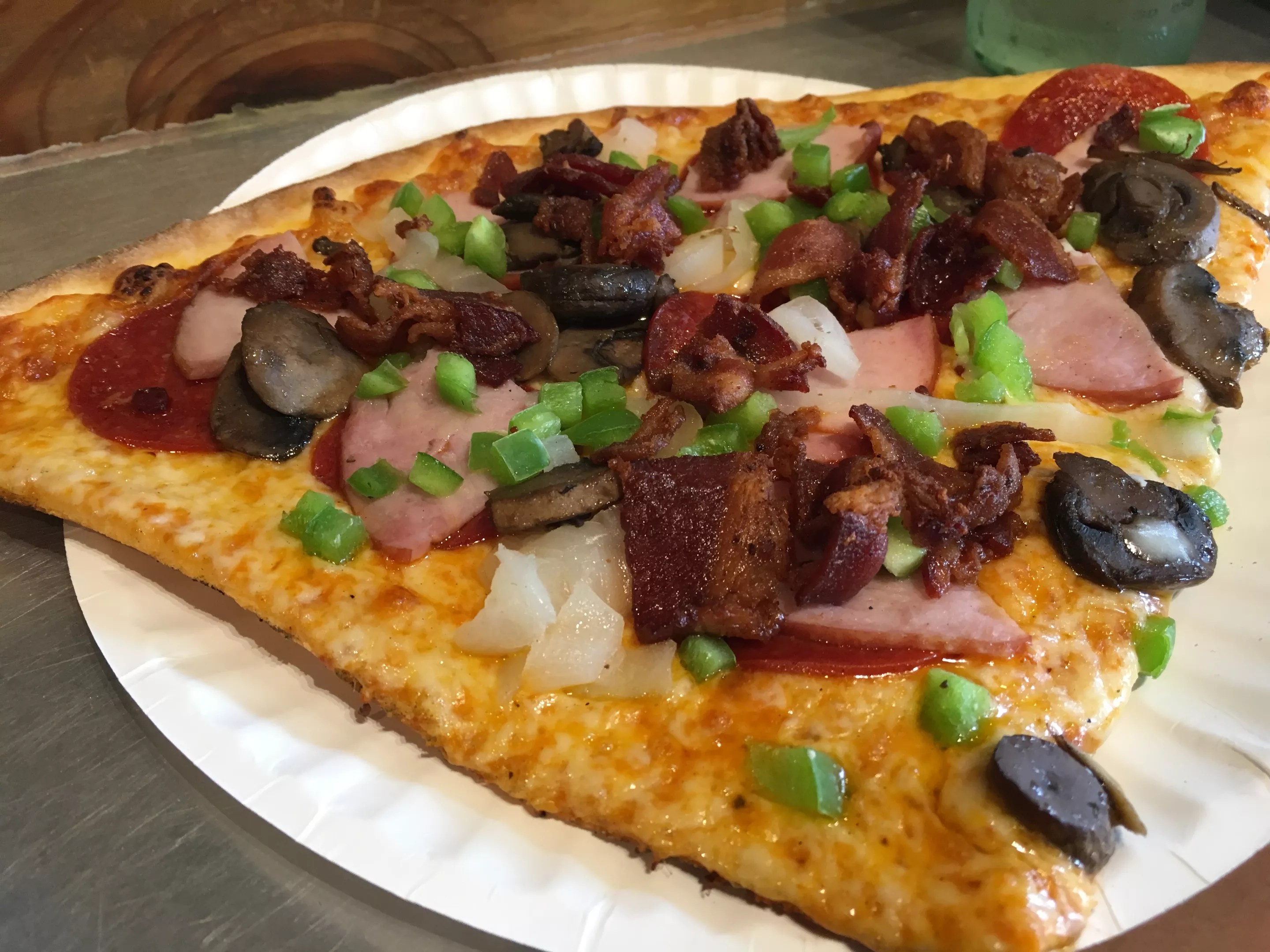 A mega slice of supreme, as the pizza lords intended it, with every kind of pork.