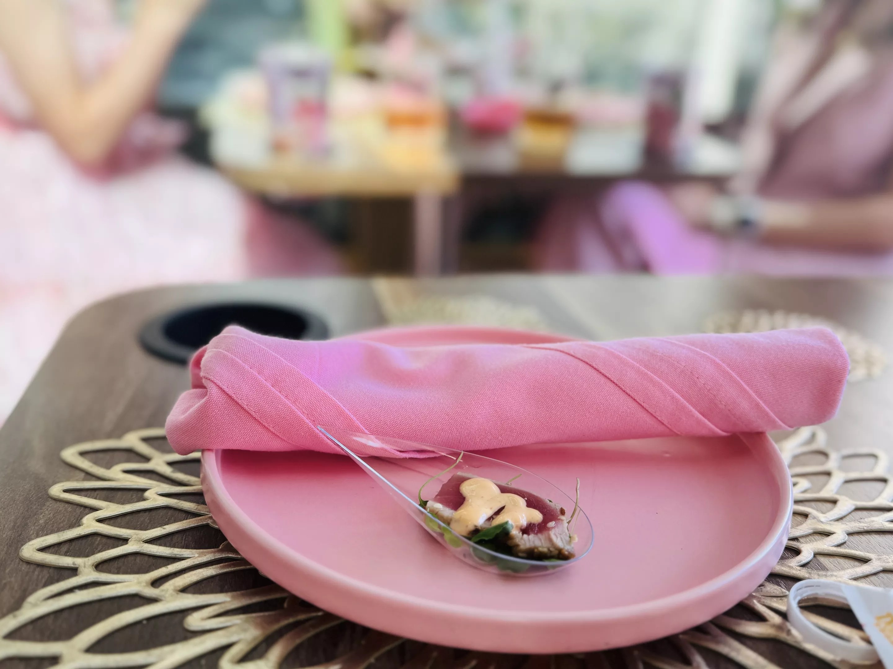 After the pink carpet is rolled out, everyone is seated upstairs at reserved tables on the enclosed top deck for a bird’s-eye view of the city, while the first floor is used as a prep kitchen for the servers. The playlist is Bridgerton meets smooth jazz, with a vibe of florals and rhinestones that feels like a garden soiree meets bachelorette party. It’s all content gold for the “camera eats first” crowd.