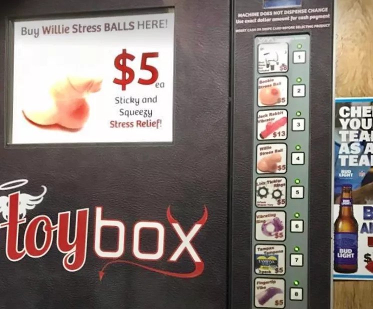 Sure, One Nostalgia is a dive bar. But the interior exhibits surprisingly dernier cri murals, a sprawling bar showcasing all sorts of patrons (Lake Highlands native Chris Harrison of The Bachelor at times among them) and a damn decent karaoke game. Still, one doesn’t anticipate some winsome, sexy surprise upon entering the ladies room. But that’s what we get. Small, clean and with no graffiti to speak of, the lavatory bears one substantial box, a sex toy-stocked vending machine. And we aren’t talking those little truck-stop ribbed condom dispensers. This is full-on cola-machine sized and carries items such as Willy Stress Balls, the “squishy squeeze super fun willy penis stress reliever ball …” according to Amazon, where they sell for $5. For the boys, there are breast-shaped squishies, too. Or just vend yourself a Jack Rabbit vibrator and enjoy your evening, even if you despise karaoke.