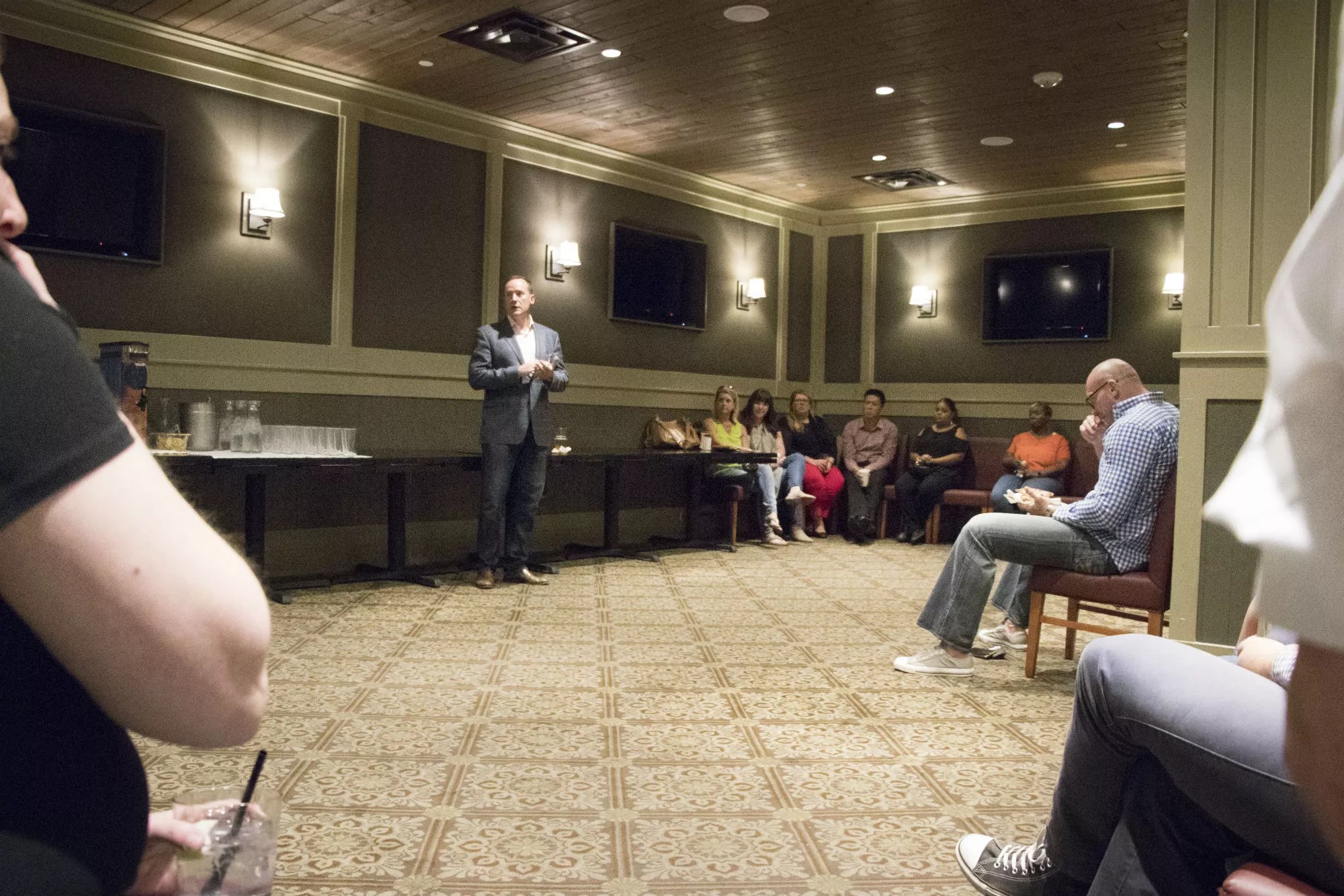 Councilman Philip Kingston spoke during a Tuesday night meeting where West End businesses and residents gathered to discuss how to change perception that the area is unsafe.