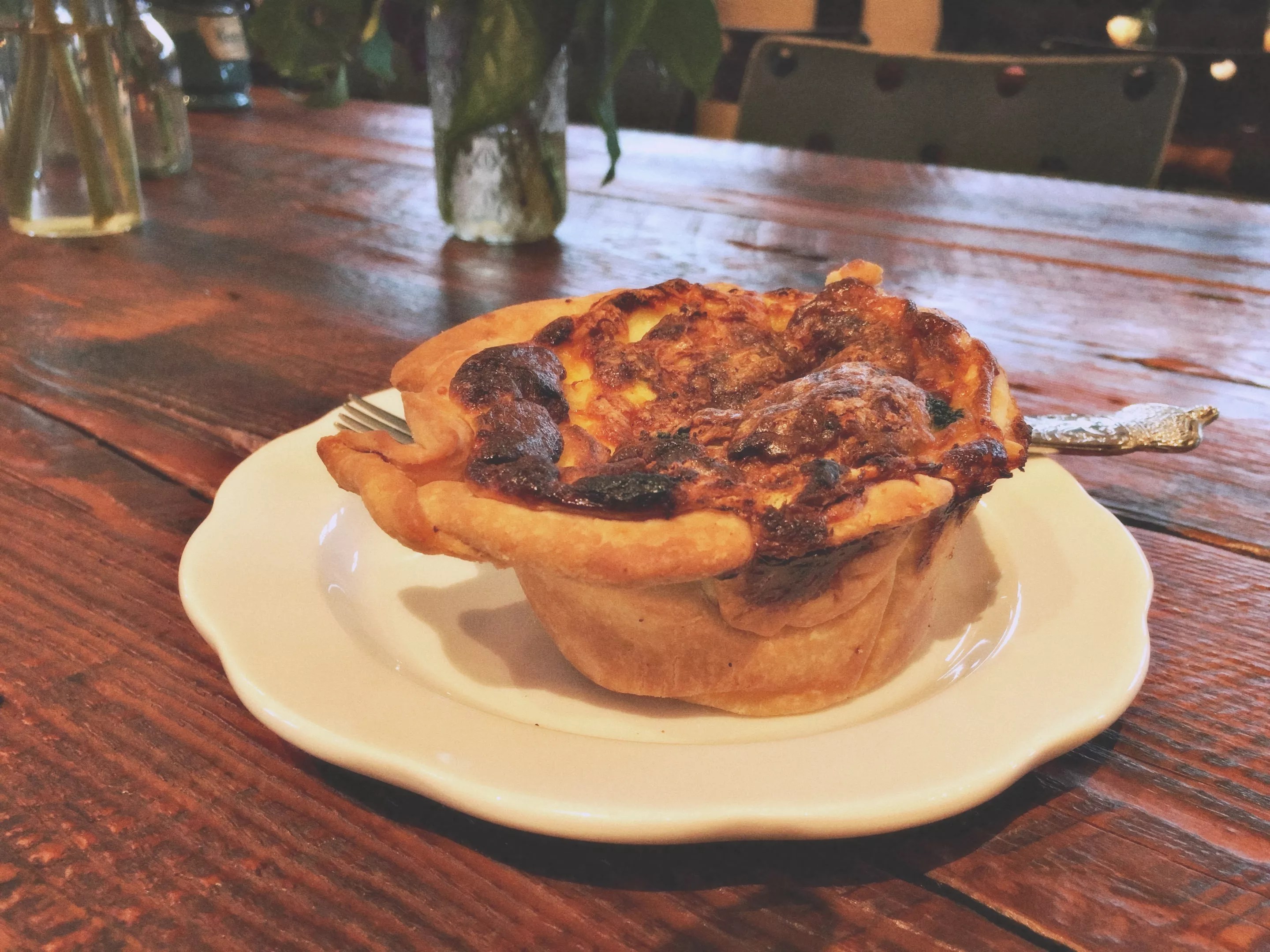 Kimzey’s offers standard coffee and tea options; they’re stocking and serving West Oak coffee as well as an assortment of teas and hot cocoa for kids. They’ll also carry a selection of freshly baked, scratch-made baked goods from the commissary kitchen at West Oak, where head chef Amanda Potter is cranking out some seriously delicious pastries. Rather than the traditional pie-slice presentation, her single-serving quiches are towering, individually crusted cups of flaky pastry filled with airy, springy egg. The asparagus in the seasonal veggie quiche was the perfect consistency and didn’t overpower the delicate egg and cheese filling. The tops are broiled slightly before serving, so they’re darker than some would expect, adding a welcome depth of flavor and texture not often encountered in coffee shop quiche. The strawberry-rhubarb pistachio galette delivered a rich, jammy filling of springtime flavors enveloped in a cradle of spot-on flaky crust.