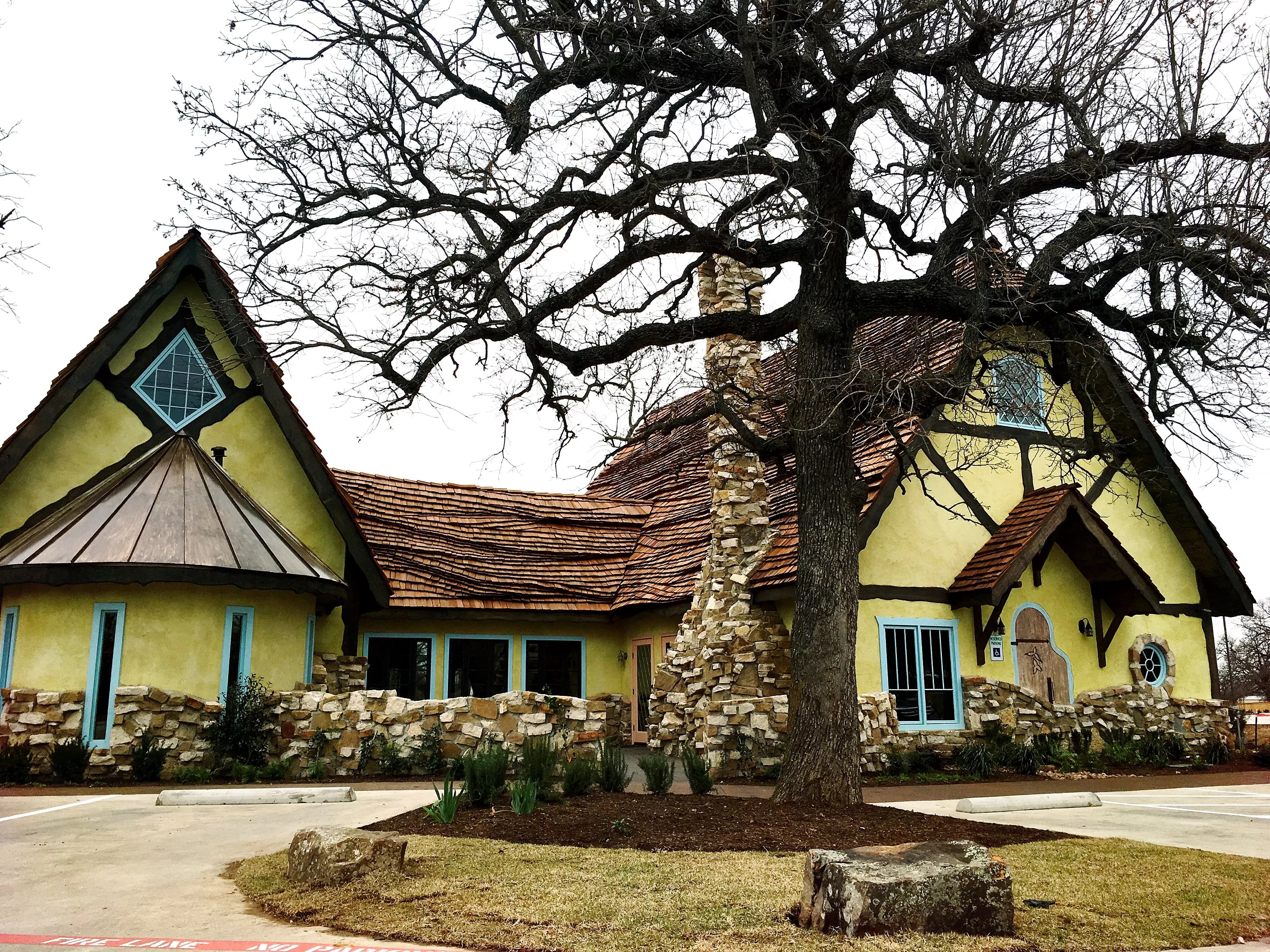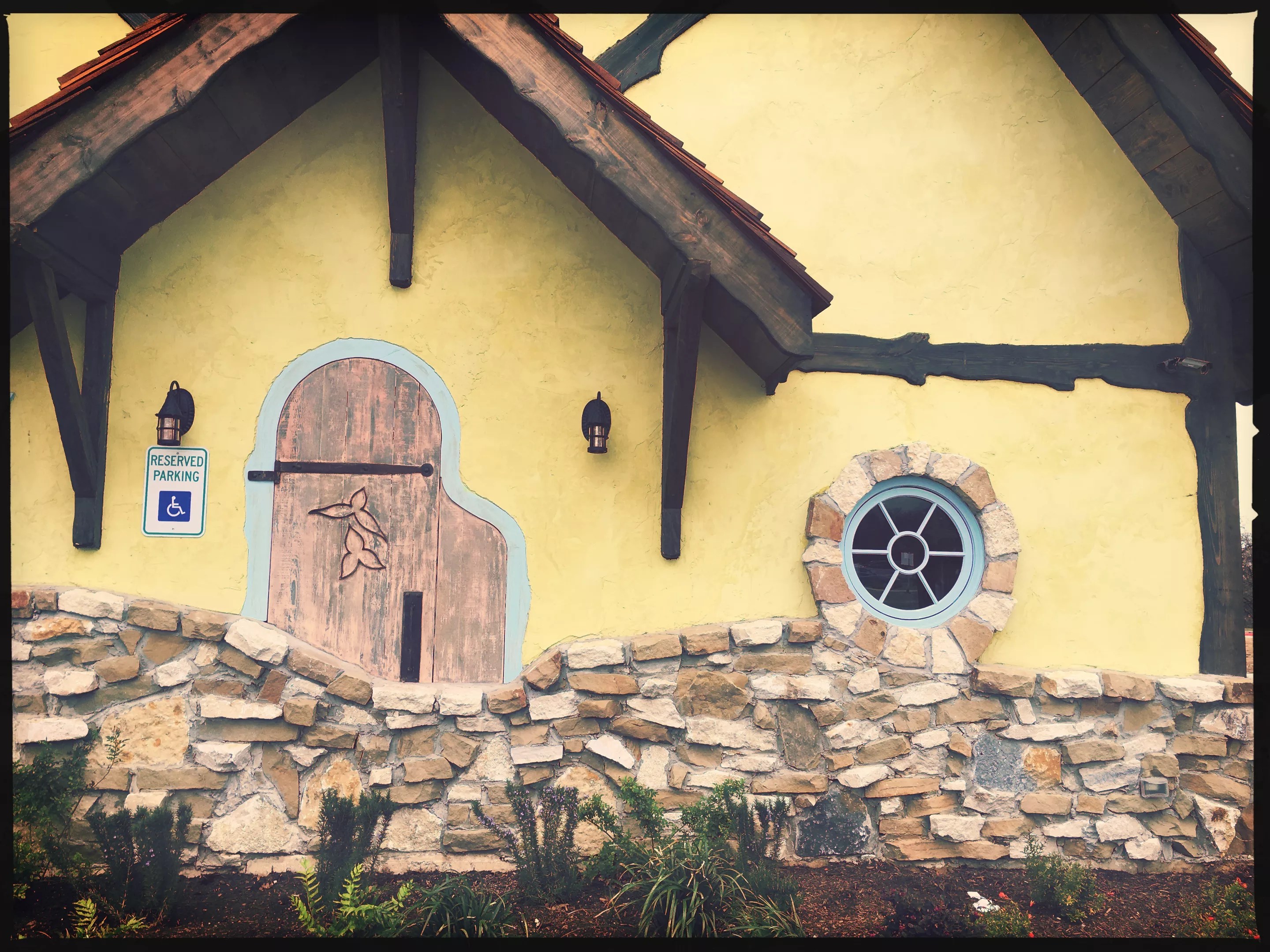 The building itself is meticulously crafted to resemble a Comstock home, a series of whimsical cottages designed and built by Hugh Comstock during the 1920s in a small seaside California town. Inspired by Arthur Rackham’s illustrated children’s books, Comstock’s creations are brick and mortar versions of storybook fantasies. During construction, Comstock purposefully didn’t use a level, so the roofing undulates and the stonework looks as if it were installed with care rather than precision.