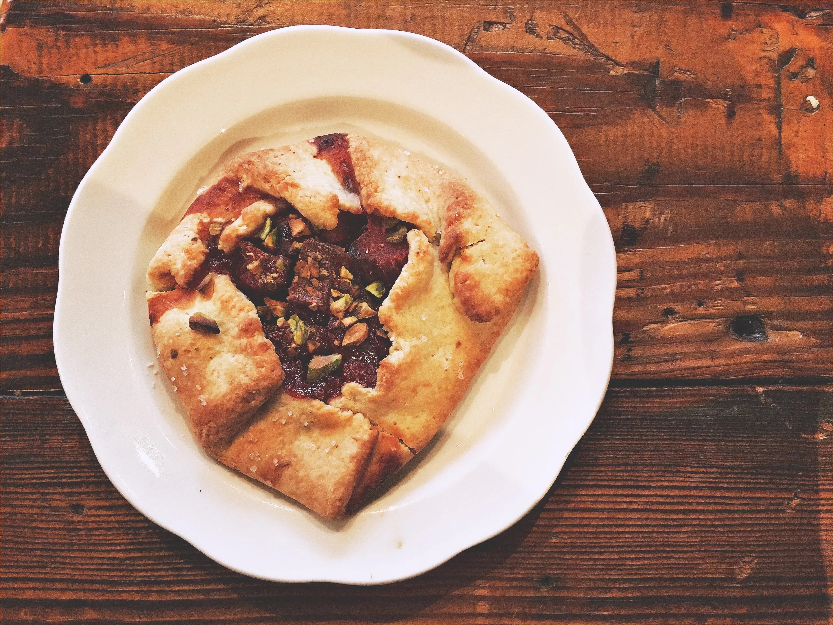 The strawberry rhubarb pistachio galette, served slightly warm, is a hearty treat of rustic spring flavors.