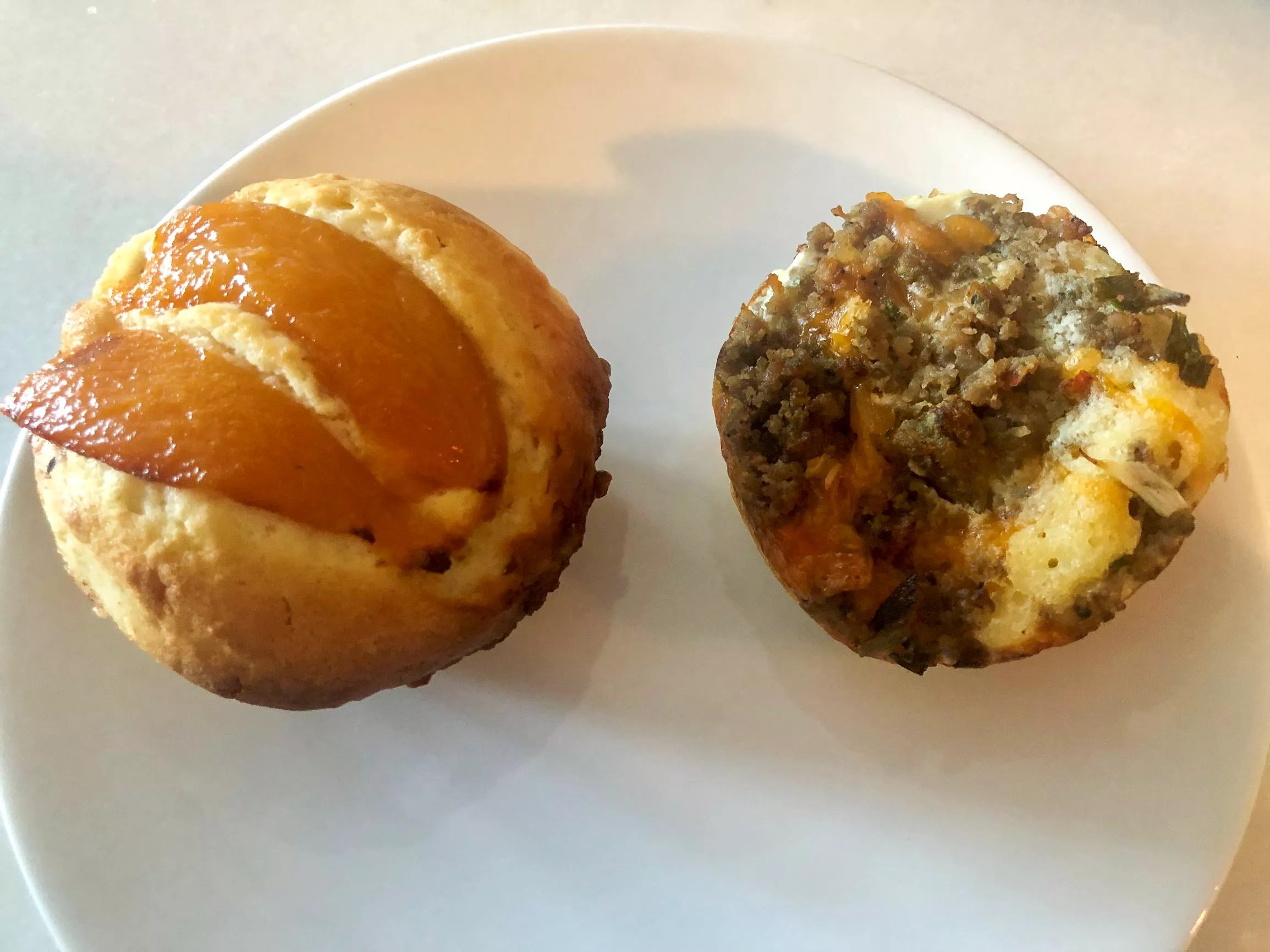 Most of the savory muffins on the menu have a whole egg baked inside, surrounded by muffin breading and topped with cheese and meat or vegetables.