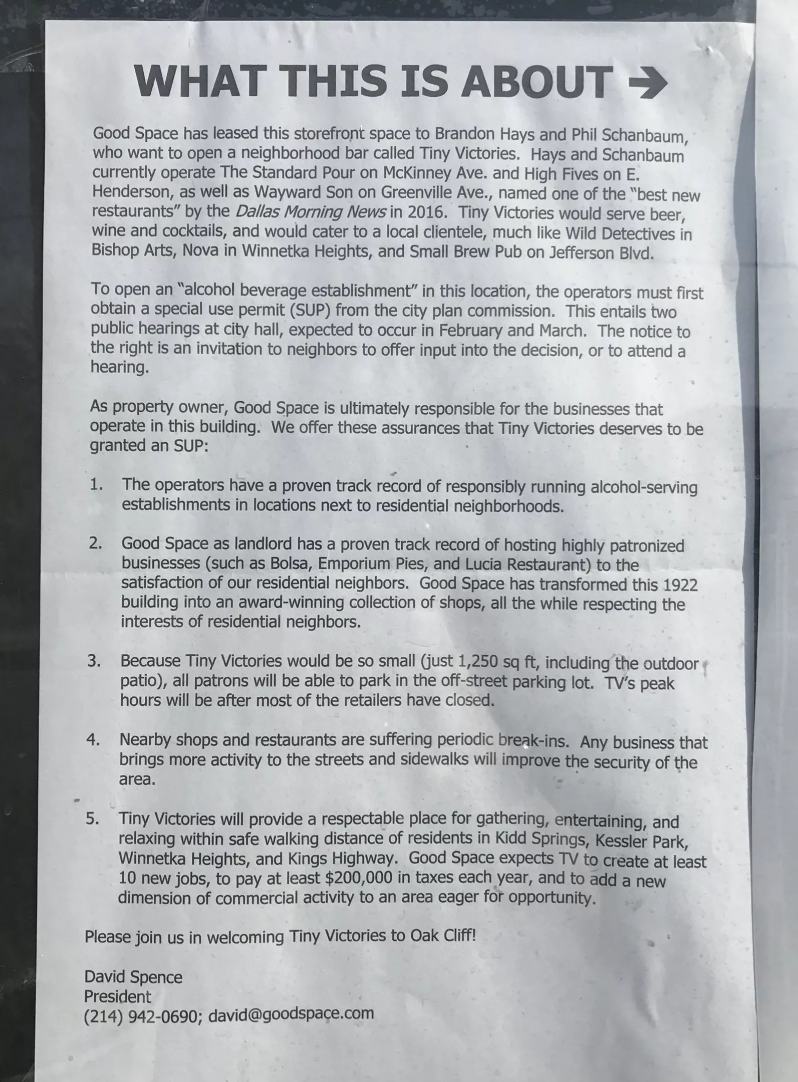 A letter from David Spence posted on the door of what is slated to become Tiny Victories, Oak Cliff’s first full-blown cocktail bar.