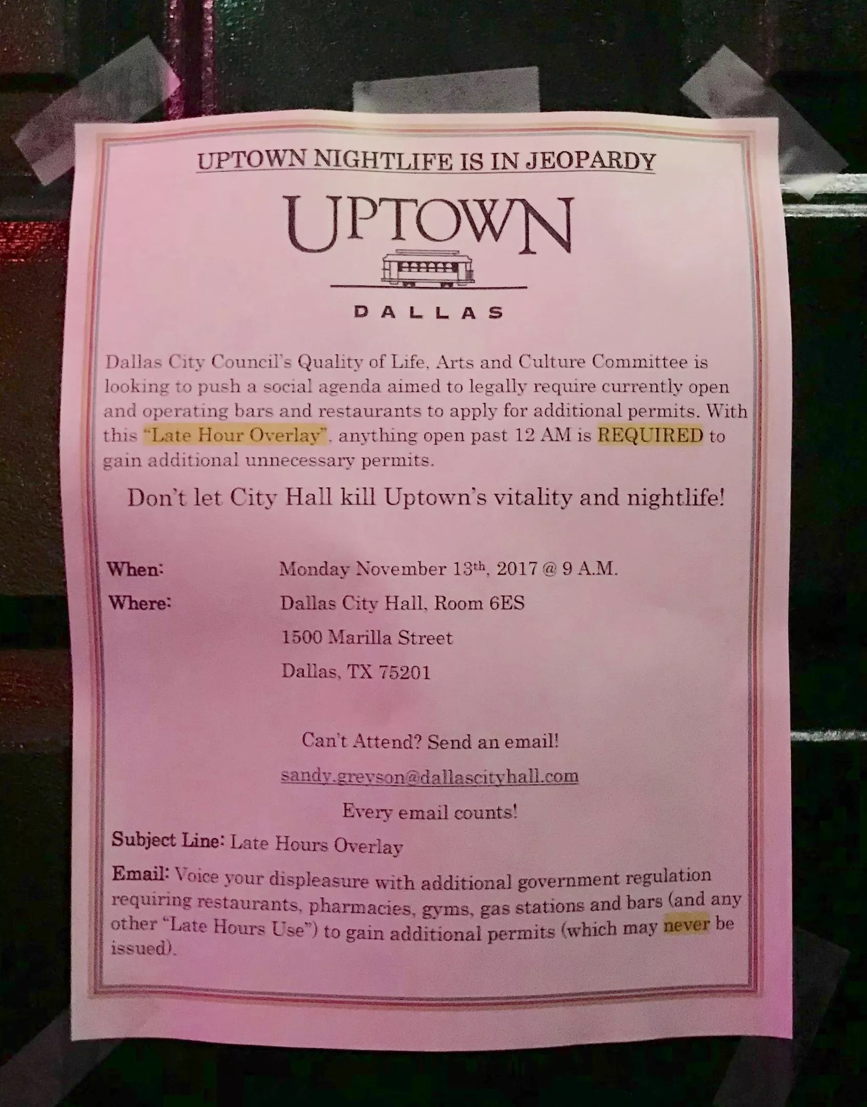 Signs posted this weekend at bars around Uptown, including Grapevine in Oak Lawn, urged customers to email District 12 council member Sandy Greyson to oppose the city’s proposed late-hours overlay. The signs used the logo of Uptown Dallas without the nonprofit’s permission. Uptown Dallas was not involved in creating or posting the signs, a spokesperson says.