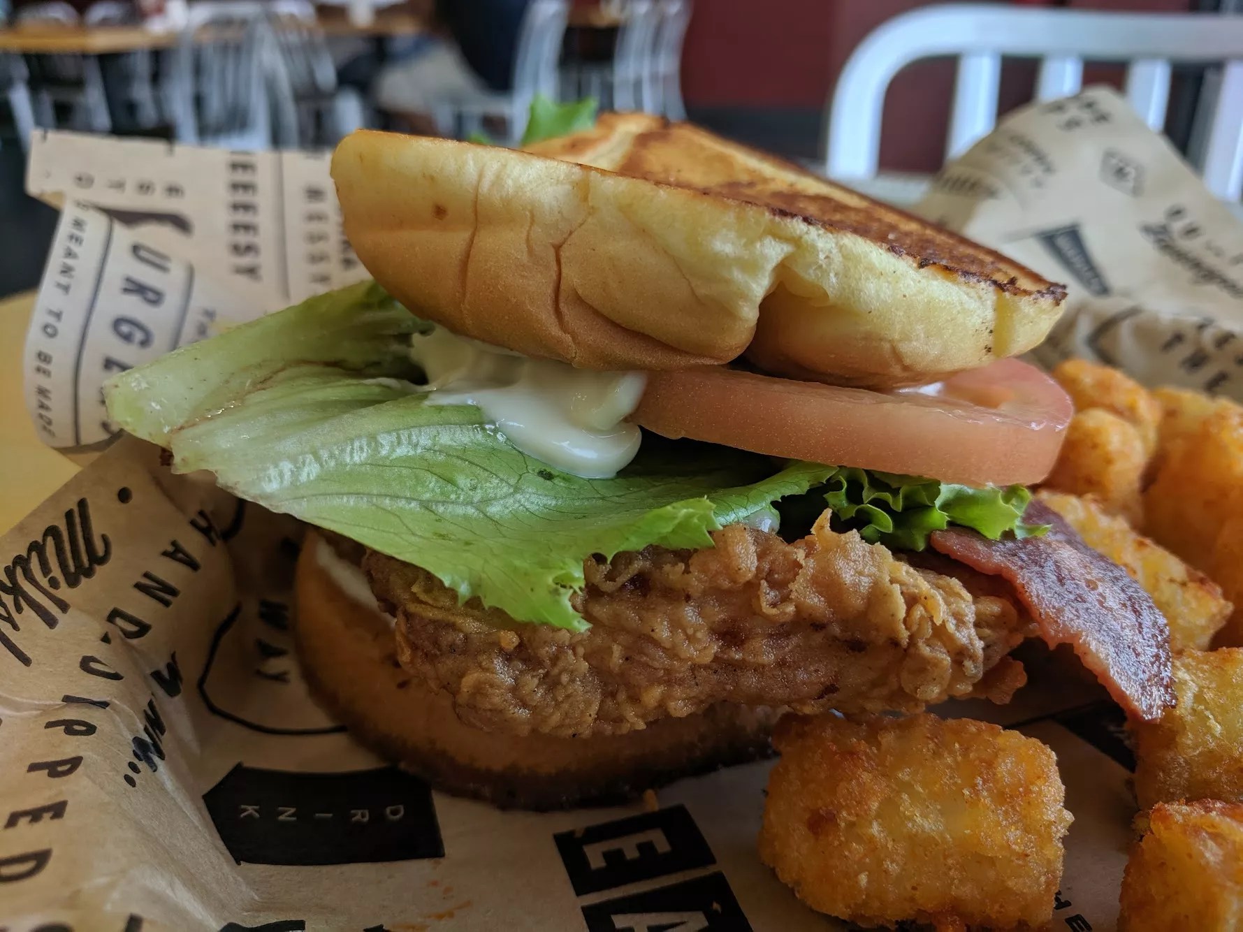 At the location on Riverside Drive in Irving, my chicken BLT arrived and I stared in wonder. The online photo had not lied: There was my bun, flipped inside out, both buttered, toasted open ends facing outward and both the top and bottom turned inward toward a slab of chicken. Well, OK, the online photo did lie a little: My chicken was fried, not grilled.